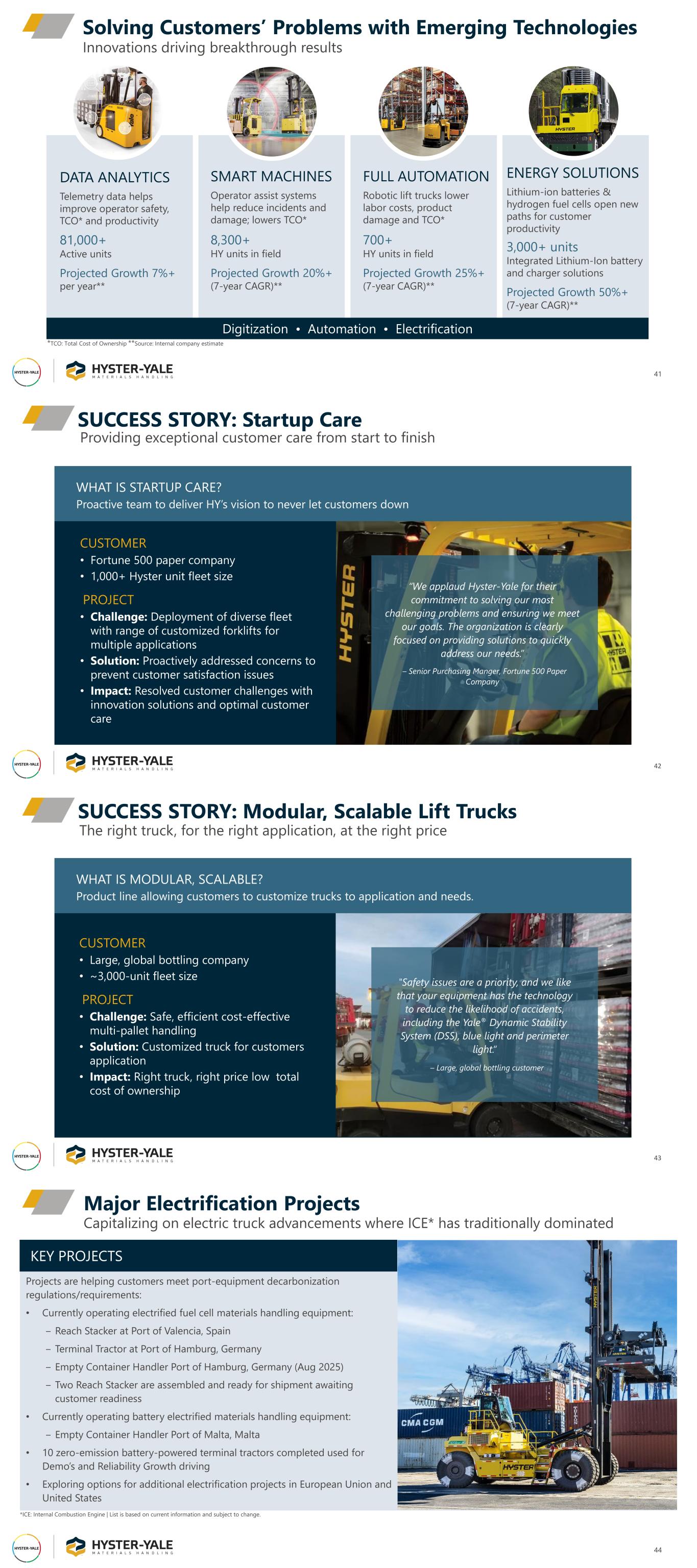 Solving Customers’ Problems with Emerging Technologies 41 Innovations driving breakthrough results DATA ANALYTICS Telemetry data helps improve operator safety, TCO* and productivity 81,000+ Active units Projected Growth 7%+ per year** SMART MACHINES Operator assist systems help reduce incidents and damage; lowers TCO* 8,300+ HY units in field Projected Growth 20%+ (7-year CAGR)** FULL AUTOMATION Robotic lift trucks lower labor costs, product damage and TCO* 700+ HY units in field Projected Growth 25%+ (7-year CAGR)** ENERGY SOLUTIONS Lithium-ion batteries & hydrogen fuel cells open new paths for customer productivity 3,000+ units Integrated Lithium-Ion battery and charger solutions Projected Growth 50%+ (7-year CAGR)** Digitization • Automation • Electrification *TCO: Total Cost of Ownership **Source: Internal company estimate SUCCESS STORY: Startup Care 42 Providing exceptional customer care from start to finish WHAT IS STARTUP CARE? Proactive team to deliver HY’s vision to never let customers down CUSTOMER • Fortune 500 paper company • 1,000+ Hyster unit fleet size PROJECT • Challenge: Deployment of diverse fleet with range of customized forklifts for multiple applications • Solution: Proactively addressed concerns to prevent customer satisfaction issues • Impact: Resolved customer challenges with innovation solutions and optimal customer care “We applaud Hyster-Yale for their commitment to solving our most challenging problems and ensuring we meet our goals. The organization is clearly focused on providing solutions to quickly address our needs.” – Senior Purchasing Manger, Fortune 500 Paper Company SUCCESS STORY: Modular, Scalable Lift Trucks 43 WHAT IS MODULAR, SCALABLE? Product line allowing customers to customize trucks to application and needs. CUSTOMER • Large, global bottling company • ~3,000-unit fleet size PROJECT • Challenge: Safe, efficient cost-effective multi-pallet handling • Solution: Customized truck for customers application • Impact: Right truck, right price low total cost of ownership "Safety issues are a priority, and we like that your equipment has the technology to reduce the likelihood of accidents, including the Yale® Dynamic Stability System (DSS), blue light and perimeter light.“ – Large, global bottling customer The right truck, for the right application, at the right price Capitalizing on electric truck advancements where ICE* has traditionally dominated Major Electrification Projects 44 *ICE: Internal Combustion Engine | List is based on current information and subject to change. KEY PROJECTS Projects are helping customers meet port-equipment decarbonization regulations/requirements: • Currently operating electrified fuel cell materials handling equipment: ‒ Reach Stacker at Port of Valencia, Spain ‒ Terminal Tractor at Port of Hamburg, Germany ‒ Empty Container Handler Port of Hamburg, Germany (Aug 2025) ‒ Two Reach Stacker are assembled and ready for shipment awaiting customer readiness • Currently operating battery electrified materials handling equipment: ‒ Empty Container Handler Port of Malta, Malta • 10 zero-emission battery-powered terminal tractors completed used for Demo’s and Reliability Growth driving • Exploring options for additional electrification projects in European Union and United States