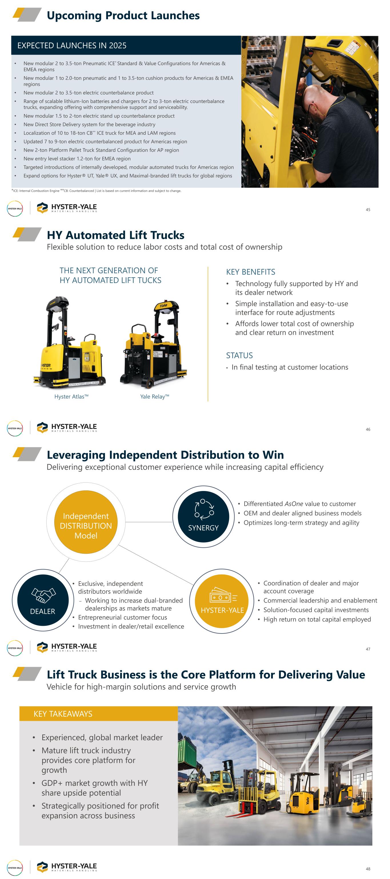 EXPECTED LAUNCHES IN 2025 • New modular 2 to 3.5-ton Pneumatic ICE* Standard & Value Configurations for Americas & EMEA regions • New modular 1 to 2.0-ton pneumatic and 1 to 3.5-ton cushion products for Americas & EMEA regions • New modular 2 to 3.5-ton electric counterbalance product • Range of scalable lithium-Ion batteries and chargers for 2 to 3-ton electric counterbalance trucks, expanding offering with comprehensive support and serviceability. • New modular 1.5 to 2-ton electric stand up counterbalance product • New Direct Store Delivery system for the beverage industry • Localization of 10 to 18-ton CB** ICE truck for MEA and LAM regions • Updated 7 to 9-ton electric counterbalanced product for Americas region • New 2-ton Platform Pallet Truck Standard Configuration for AP region • New entry level stacker 1.2-ton for EMEA region • Targeted introductions of internally developed, modular automated trucks for Americas region • Expand options for Hyster® UT, Yale® UX, and Maximal-branded lift trucks for global regions 45 Upcoming Product Launches *ICE: Internal Combustion Engine **CB: Counterbalanced | List is based on current information and subject to change. HY Automated Lift Trucks 46 Flexible solution to reduce labor costs and total cost of ownership KEY BENEFITS • Technology fully supported by HY and its dealer network • Simple installation and easy-to-use interface for route adjustments • Affords lower total cost of ownership and clear return on investment STATUS • In final testing at customer locations THE NEXT GENERATION OF HY AUTOMATED LIFT TUCKS Hyster Atlas Yale Relay Leveraging Independent Distribution to Win 47 Delivering exceptional customer experience while increasing capital efficiency Independent DISTRIBUTION Model • Exclusive, independent distributors worldwide ‒ Working to increase dual-branded dealerships as markets mature • Entrepreneurial customer focus • Investment in dealer/retail excellence • Coordination of dealer and major account coverage • Commercial leadership and enablement • Solution-focused capital investments • High return on total capital employed • Differentiated AsOne value to customer • OEM and dealer aligned business models • Optimizes long-term strategy and agility SYNERGY DEALER HYSTER-YALE Lift Truck Business is the Core Platform for Delivering Value 48 Vehicle for high-margin solutions and service growth KEY TAKEAWAYS • Experienced, global market leader • Mature lift truck industry provides core platform for growth • GDP+ market growth with HY share upside potential • Strategically positioned for profit expansion across business
