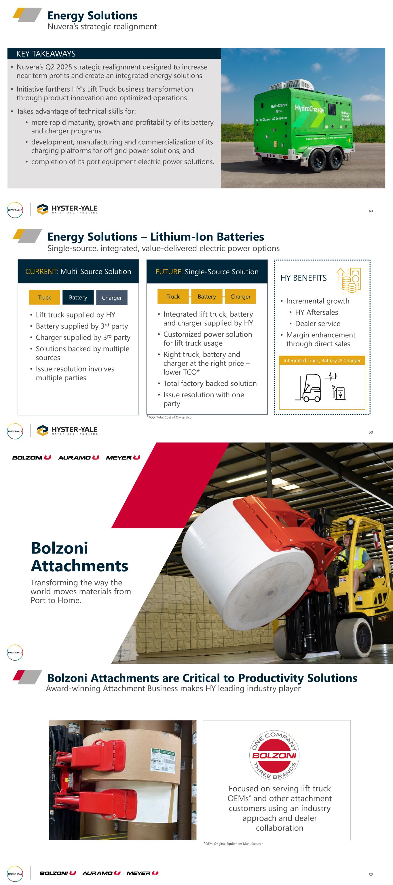 Energy Solutions 49 Nuvera’s strategic realignment • Nuvera’s Q2 2025 strategic realignment designed to increase near term profits and create an integrated energy solutions • Initiative furthers HY’s Lift Truck business transformation through product innovation and optimized operations • Takes advantage of technical skills for: • more rapid maturity, growth and profitability of its battery and charger programs, • development, manufacturing and commercialization of its charging platforms for off grid power solutions, and • completion of its port equipment electric power solutions. KEY TAKEAWAYS Energy Solutions – Lithium-Ion Batteries 50 Single-source, integrated, value-delivered electric power options CURRENT: Multi-Source Solution • Lift truck supplied by HY • Battery supplied by 3rd party • Charger supplied by 3rd party • Solutions backed by multiple sources • Issue resolution involves multiple parties FUTURE: Single-Source Solution Truck Battery Charger Truck Battery Charger HY BENEFITS • Incremental growth • HY Aftersales • Dealer service • Margin enhancement through direct sales *TCO: Total Cost of Ownership • Integrated lift truck, battery and charger supplied by HY • Customized power solution for lift truck usage • Right truck, battery and charger at the right price – lower TCO* • Total factory backed solution • Issue resolution with one party Integrated Truck, Battery & Charger Bolzoni Attachments Need a good Bolzoni photo on a Hyster truck Transforming the way the world moves materials from Port to Home. Award-winning Attachment Business makes HY leading industry player Bolzoni Attachments are Critical to Productivity Solutions 52 Focused on serving lift truck OEMs* and other attachment customers using an industry approach and dealer collaboration *OEM: Original Equipment Manufacturer