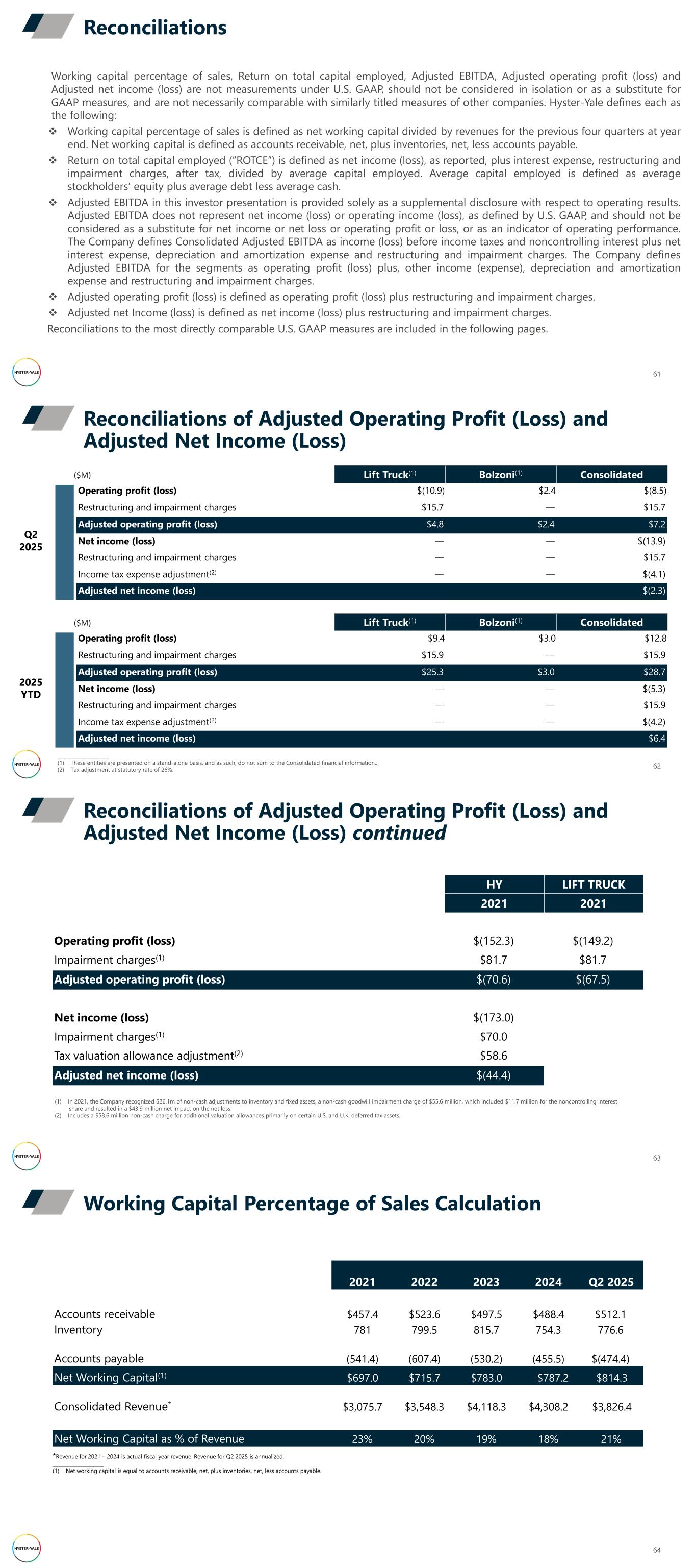 Reconciliations 61 Working capital percentage of sales, Return on total capital employed, Adjusted EBITDA, Adjusted operating profit (loss) and Adjusted net income (loss) are not measurements under U.S. GAAP, should not be considered in isolation or as a substitute for GAAP measures, and are not necessarily comparable with similarly titled measures of other companies. Hyster-Yale defines each as the following:  Working capital percentage of sales is defined as net working capital divided by revenues for the previous four quarters at year end. Net working capital is defined as accounts receivable, net, plus inventories, net, less accounts payable.  Return on total capital employed (“ROTCE”) is defined as net income (loss), as reported, plus interest expense, restructuring and impairment charges, after tax, divided by average capital employed. Average capital employed is defined as average stockholders’ equity plus average debt less average cash.  Adjusted EBITDA in this investor presentation is provided solely as a supplemental disclosure with respect to operating results. Adjusted EBITDA does not represent net income (loss) or operating income (loss), as defined by U.S. GAAP, and should not be considered as a substitute for net income or net loss or operating profit or loss, or as an indicator of operating performance. The Company defines Consolidated Adjusted EBITDA as income (loss) before income taxes and noncontrolling interest plus net interest expense, depreciation and amortization expense and restructuring and impairment charges. The Company defines Adjusted EBITDA for the segments as operating profit (loss) plus, other income (expense), depreciation and amortization expense and restructuring and impairment charges.  Adjusted operating profit (loss) is defined as operating profit (loss) plus restructuring and impairment charges.  Adjusted net Income (loss) is defined as net income (loss) plus restructuring and impairment charges. Reconciliations to the most directly comparable U.S. GAAP measures are included in the following pages. Reconciliations of Adjusted Operating Profit (Loss) and Adjusted Net Income (Loss) 62 Lift Truck(1) Bolzoni(1) Consolidated Operating profit (loss) $(10.9) $2.4 $(8.5) Restructuring and impairment charges $15.7 — $15.7 Adjusted operating profit (loss) $4.8 $2.4 $7.2 Net income (loss) — — $(13.9) Restructuring and impairment charges — — $15.7 Income tax expense adjustment(2) — — $(4.1) Adjusted net income (loss) $(2.3) _____________________ (1) These entities are presented on a stand-alone basis, and as such, do not sum to the Consolidated financial information.. (2) Tax adjustment at statutory rate of 26%. Q2 2025 ($M) 2025 YTD Lift Truck(1) Bolzoni(1) Consolidated Operating profit (loss) $9.4 $3.0 $12.8 Restructuring and impairment charges $15.9 — $15.9 Adjusted operating profit (loss) $25.3 $3.0 $28.7 Net income (loss) — — $(5.3) Restructuring and impairment charges — — $15.9 Income tax expense adjustment(2) — — $(4.2) Adjusted net income (loss) $6.4 ($M) Reconciliations of Adjusted Operating Profit (Loss) and Adjusted Net Income (Loss) continued 63 HY LIFT TRUCK 2021 2021 Operating profit (loss) $(152.3) $(149.2) Impairment charges(1) $81.7 $81.7 Adjusted operating profit (loss) $(70.6) $(67.5) Net income (loss) $(173.0) Impairment charges(1) $70.0 Tax valuation allowance adjustment(2) $58.6 Adjusted net income (loss) $(44.4) _____________________ (1) In 2021, the Company recognized $26.1m of non-cash adjustments to inventory and fixed assets, a non-cash goodwill impairment charge of $55.6 million, which included $11.7 million for the noncontrolling interest share and resulted in a $43.9 million net impact on the net loss. (2) Includes a $58.6 million non-cash charge for additional valuation allowances primarily on certain U.S. and U.K. deferred tax assets. Working Capital Percentage of Sales Calculation 64 2021 2022 2023 2024 Q2 2025 Accounts receivable $457.4 $523.6 $497.5 $488.4 $512.1 Inventory 781 799.5 815.7 754.3 776.6 Accounts payable (541.4) (607.4) (530.2) (455.5) $(474.4) Net Working Capital(1) $697.0 $715.7 $783.0 $787.2 $814.3 Consolidated Revenue* $3,075.7 $3,548.3 $4,118.3 $4,308.2 $3,826.4 Net Working Capital as % of Revenue 23% 20% 19% 18% 21% *Revenue for 2021 – 2024 is actual fiscal year revenue. Revenue for Q2 2025 is annualized. _____________________ (1) Net working capital is equal to accounts receivable, net, plus inventories, net, less accounts payable.