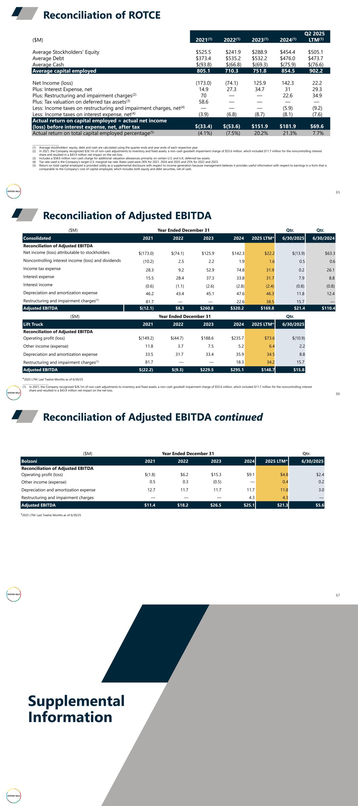 65 Reconciliation of ROTCE Q2 2025 ($M) 2021(1) 2022(1) 2023(1) 2024(1) LTM(1) Average Stockholders' Equity $525.5 $241.9 $288.9 $454.4 $505.1 Average Debt $373.4 $535.2 $532.2 $476.0 $473.7 Average Cash $(93.8) $(66.8) $(69.3) $(75.9) $(76.6) Average capital employed 805.1 710.3 751.8 854.5 902.2 Net Income (loss) (173.0) (74.1) 125.9 142.3 22.2 Plus: Interest Expense, net 14.9 27.3 34.7 31 29.3 Plus: Restructuring and impairment charges(2) 70 — — 22.6 34.9 Plus: Tax valuation on deferred tax assets(3) 58.6 — — — — Less: Income taxes on restructuring and impairment charges, net(4) — — — (5.9) (9.2) Less: Income taxes on interest expense, net(4) (3.9) (6.8) (8.7) (8.1) (7.6) Actual return on capital employed = actual net income (loss) before interest expense, net, after tax $(33.4) $(53.6) $151.9 $181.9 $69.6 Actual return on total capital employed percentage(5) (4.1%) (7.5%) 20.2% 21.3% 7.7% _____________________ (1) Average stockholders' equity, debt and cash are calculated using the quarter ends and year ends of each respective year. (2) In 2021, the Company recognized $26.1m of non-cash adjustments to inventory and fixed assets, a non-cash goodwill impairment charge of $55.6 million, which included $11.7 million for the noncontrolling interest share and resulted in a $43.9 million net impact on the net loss. (3) Includes a $58.6 million non-cash charge for additional valuation allowances primarily on certain U.S. and U.K. deferred tax assets. (4) Tax rate used is the Company's target U.S. marginal tax rate. Rates used were 26% for 2021, 2024 and 2025 and 25% for 2022 and 2023. (5) Return on total capital employed is provided solely as a supplemental disclosure with respect to income generation because management believes it provides useful information with respect to earnings in a form that is comparable to the Company's cost of capital employed, which includes both equity and debt securities, net of cash. Reconciliation of Adjusted EBITDA 66 ($M) Year Ended December 31 Qtr. Qtr. Consolidated 2021 2022 2023 2024 2025 LTM* 6/30/2025 6/30/2024 Reconciliation of Adjusted EBITDA Net income (loss) attributable to stockholders $(173.0) $(74.1) $125.9 $142.3 $22.2 $(13.9) $63.3 Noncontrolling interest income (loss) and dividends (10.2) 2.5 2.2 1.9 1.6 0.5 0.6 Income tax expense 28.3 9.2 52.9 74.8 31.9 0.2 26.1 Interest expense 15.5 28.4 37.3 33.8 31.7 7.9 8.8 Interest income (0.6) (1.1) (2.6) (2.8) (2.4) (0.8) (0.8) Depreciation and amortization expense 46.2 43.4 45.1 47.6 46.3 11.8 12.4 Restructuring and impairment charges(1) 81.7 — — 22.6 38.5 15.7 — Adjusted EBITDA $(12.1) $8.3 $260.8 $320.2 $169.8 $21.4 $110.4 ($M) Year Ended December 31 Qtr. Lift Truck 2021 2022 2023 2024 2025 LTM* 6/30/2025 Reconciliation of Adjusted EBITDA Operating profit (loss) $(149.2) $(44.7) $188.6 $235.7 $73.6 $(10.9) Other income (expense) 11.8 3.7 7.5 5.2 6.4 2.2 Depreciation and amortization expense 33.5 31.7 33.4 35.9 34.5 8.8 Restructuring and impairment charges(1) 81.7 — — 18.3 34.2 15.7 Adjusted EBITDA $(22.2) $(9.3) $229.5 $295.1 $148.7 $15.8 *2025 LTM: Last Twelve Months as of 6/30/25 _____________________ (1) In 2021, the Company recognized $26.1m of non-cash adjustments to inventory and fixed assets, a non-cash goodwill impairment charge of $55.6 million, which included $11.7 million for the noncontrolling interest share and resulted in a $43.9 million net impact on the net loss. Reconciliation of Adjusted EBITDA continued 67 ($M) Year Ended December 31 Qtr. Bolzoni 2021 2022 2023 2024 2025 LTM* 6/30/2025 Reconciliation of Adjusted EBITDA Operating profit (loss) $(1.8) $6.2 $15.3 $9.1 $4.8 $2.4 Other income (expense) 0.5 0.3 (0.5) — 0.4 0.2 Depreciation and amortization expense 12.7 11.7 11.7 11.7 11.8 3.0 Restructuring and impairment charges — — — 4.3 4.3 — Adjusted EBITDA $11.4 $18.2 $26.5 $25.1 $21.3 $5.6 *2025 LTM: Last Twelve Months as of 6/30/25 Supplemental Information