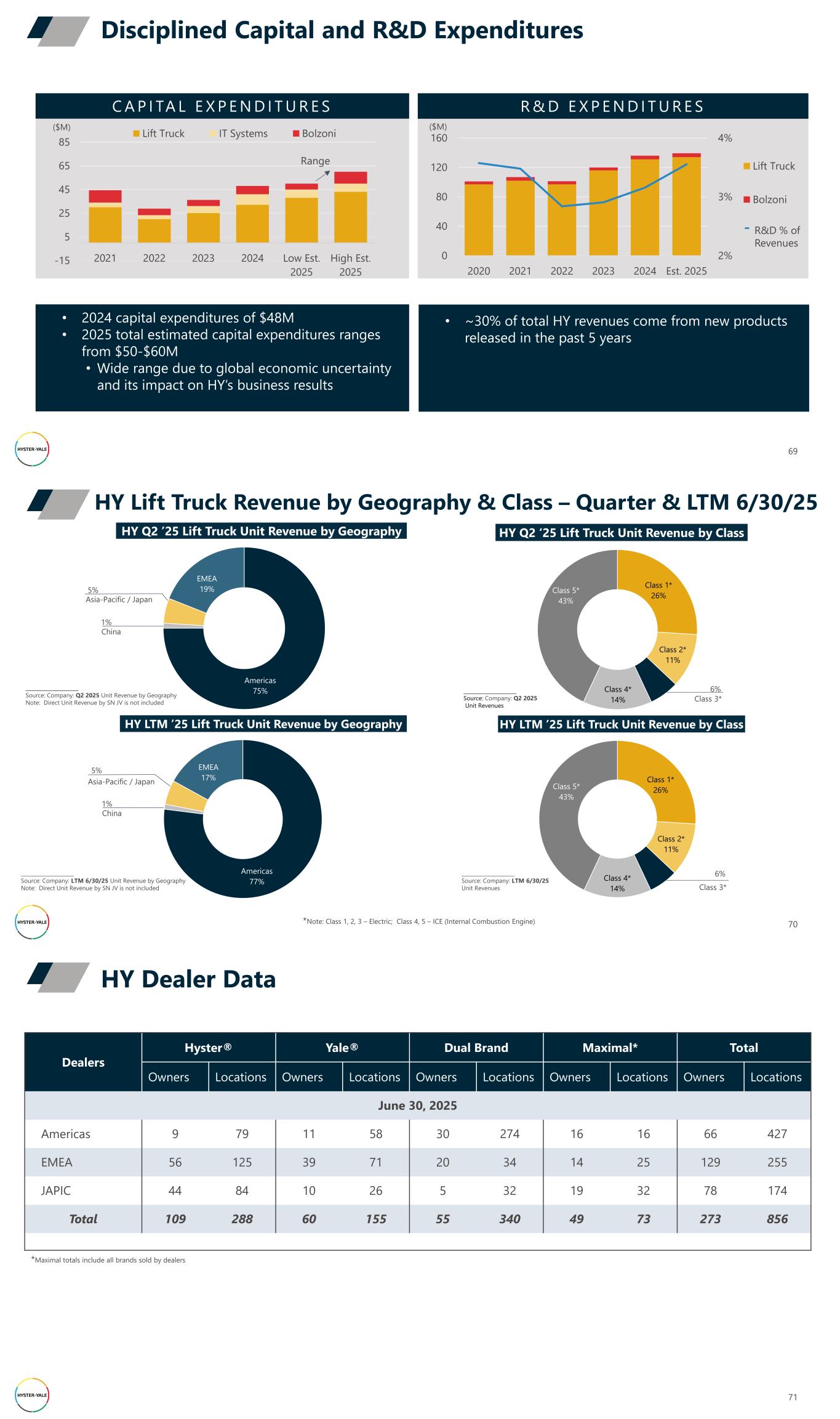 Disciplined Capital and R&D Expenditures 69 -15 5 25 45 65 85 2021 2022 2023 2024 Low Est. 2025 High Est. 2025 Lift Truck IT Systems Bolzoni C A P I TA L E X P E N D I T U R E S R & D E X P E N D I T U R E S 2% 3% 4% 0 40 80 120 160 2020 2021 2022 2023 2024 Est. 2025 Lift Truck Bolzoni ($M) ($M) • ~30% of total HY revenues come from new products released in the past 5 years R&D % of Revenues • 2024 capital expenditures of $48M • 2025 total estimated capital expenditures ranges from $50-$60M • Wide range due to global economic uncertainty and its impact on HY’s business results Range Americas 75% EMEA 19% Class 1* 26% Class 2* 11% Class 4* 14% Class 5* 43% _____________________ Source: Company: Q2 2025 Unit Revenues Americas 77% EMEA 17% HY Lift Truck Revenue by Geography & Class – Quarter & LTM 6/30/25 70 Class 1* 26% Class 2* 11% Class 4* 14% Class 5* 43% 6% Class 3* _____________________ Source: Company: LTM 6/30/25 Unit Revenues _____________________ Source: Company: LTM 6/30/25 Unit Revenue by Geography Note: Direct Unit Revenue by SN JV is not included HY Q2 ‘25 Lift Truck Unit Revenue by ClassHY Q2 ’25 Lift Truck Unit Revenue by Geography HY LTM ’25 Lift Truck Unit Revenue by Geography HY LTM ’25 Lift Truck Unit Revenue by Class 5% Asia-Pacific / Japan 5% Asia-Pacific / Japan 6% Class 3* _____________________ Source: Company: Q2 2025 Unit Revenue by Geography Note: Direct Unit Revenue by SN JV is not included China 1% China 1% *Note: Class 1, 2, 3 – Electric; Class 4, 5 – ICE (Internal Combustion Engine) HY Dealer Data 71 Dealers Hyster® Yale® Dual Brand Maximal* Total Owners Locations Owners Locations Owners Locations Owners Locations Owners Locations June 30, 2025 Americas 9 79 11 58 30 274 16 16 66 427 EMEA 56 125 39 71 20 34 14 25 129 255 JAPIC 44 84 10 26 5 32 19 32 78 174 Total 109 288 60 155 55 340 49 73 273 856 *Maximal totals include all brands sold by dealers