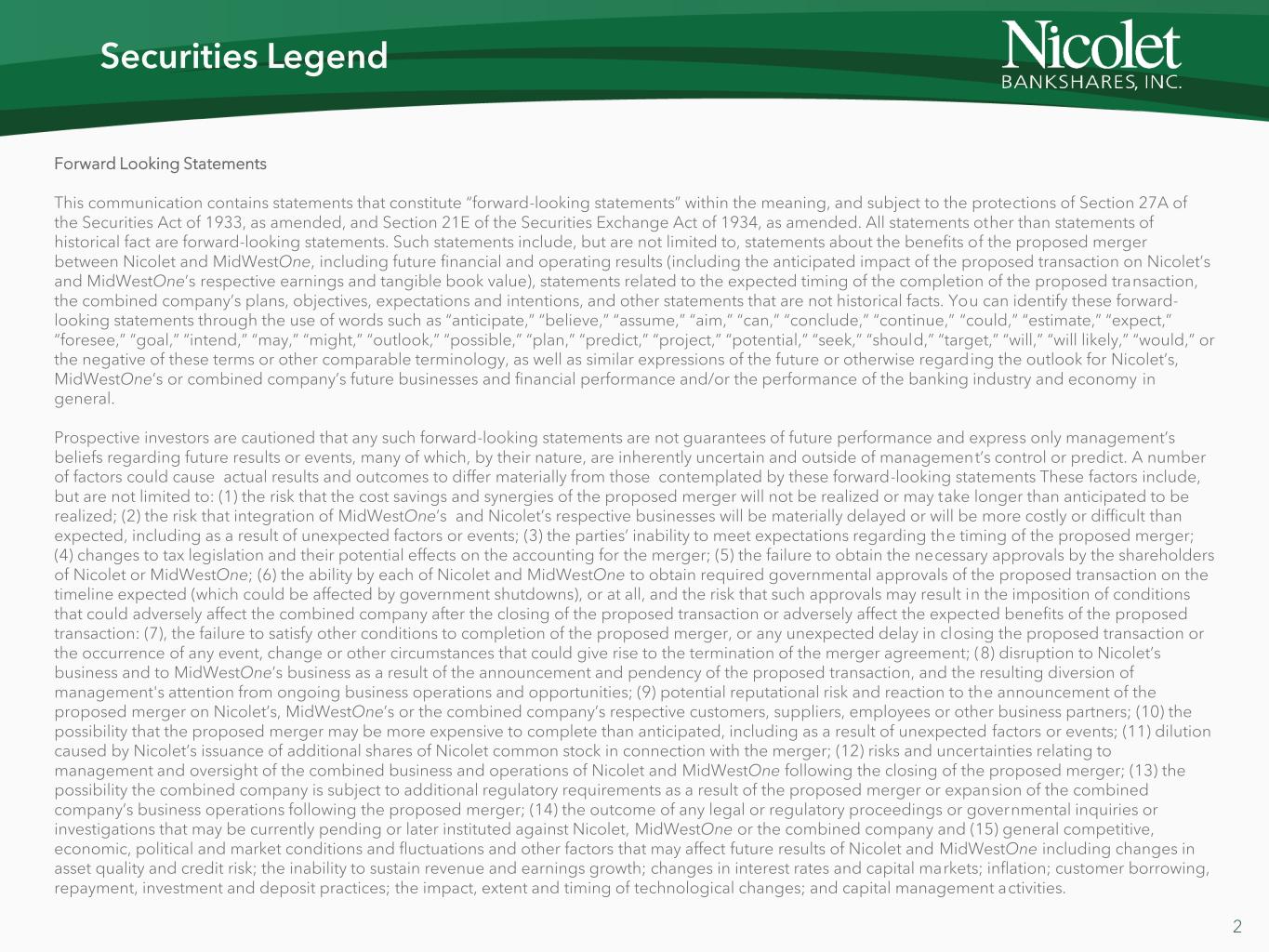 3 Additional factors which could affect future results of Nicolet and MidWestOne can be found in Nicolet’s or MidWestOne’s filings with the U.S. Securities and Exchange Commission (“SEC”), including in Nicolet’s Annual Report on Form 10-K for the year ended December 31, 2024 under the captions “Forward-Looking Statements” and “Risk Factors,” MidWestOne’s Annual Report on Form 10-K for the year ended December 31, 2024, under the captions “Cautionary Note Regarding Forward-Looking Statements” and “Risk Factors,” as well as their other filings with the SEC, which shareholders and potential investors should review for a more detailed discussion of risks, uncertainties and factors that could cause actual results to differ from those discussed in the forward-looking statements All forward-looking statements included in this communication are made as of the date hereof and are based on information available to management at that time. Except as required by law, neither Nicolet nor MidWestOne assumes any obligation to update any forward-looking statement to reflect events or circumstances that occur after the date the forward-looking statements were made. Important Information About the Merger and Where to Find It Nicolet intends to file a registration statement on Form S-4 with the SEC to register the Nicolet shares that will be issued to MidWestOne shareholders in connection with the proposed merger. The registration statement will include a joint proxy statement of Nicolet and MidWestOne that also constitutes a prospectus of Nicolet. When available, the definitive joint proxy statement/prospectus will be sent to shareholders of Nicolet and MidWestOne in connection with the proposed merger. BEFORE MAKING ANY VOTING OR INVESTMENT DECISION, INVESTORS AND SECURITY HOLDERS ARE URGED TO READ THE REGISTRTION STATEMENT AND JOINT PROXY STATEMENT/PROSPECTUS WHEN THEY BECOME AVAILABLE (AND ANY OTHER DOCUMENTS FILED WITH THE SEC IN CONNECTION WITH THE PROPOSED MERGER OR INCORPORATED BY REFERENCE IN THE JOINT PROXY STATEMENT/PROSPECTUS) BECAUSE SUCH DOCUMENTS WILL CONTAIN IMPORTANT INFORMATION ABOUT NICOLET, MIDWESTONE AND THE PROPOSED MERGER. Investors may obtain copies of the joint proxy statement/prospectus and other relevant documents (as they become available) free of charge at the SEC’s website (www.sec.gov). Copies of the documents filed with the SEC by Nicolet will be available free of charge on Nicolet’s website at www.nicoletbank.com. Copies of the documents filed with the SEC by MidWestOne will be available free of charge on MidWestOne’s website at https://www.midwestonefinancial.com/overview/default.aspx. Securities LegendSecurities Legend
