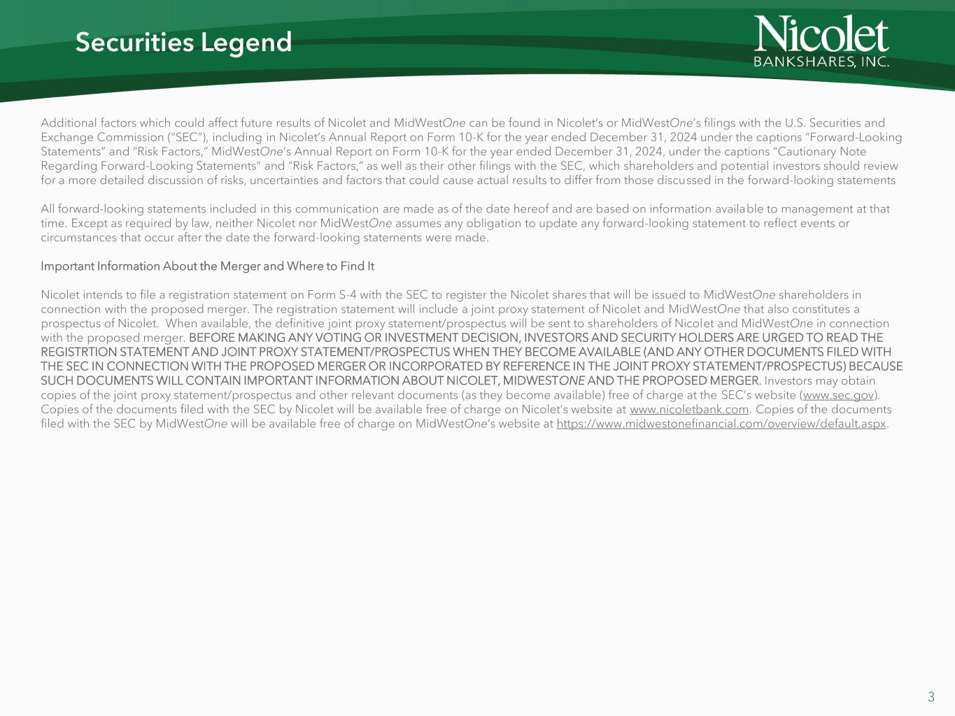2 Forward Looking Statements This communication contains statements that constitute “forward-looking statements” within the meaning, and subject to the protections of Section 27A of the Securities Act of 1933, as amended, and Section 21E of the Securities Exchange Act of 1934, as amended. All statements other than statements of historical fact are forward-looking statements. Such statements include, but are not limited to, statements about the benefits of the proposed merger between Nicolet and MidWestOne, including future financial and operating results (including the anticipated impact of the proposed transaction on Nicolet’s and MidWestOne’s respective earnings and tangible book value), statements related to the expected timing of the completion of the proposed transaction, the combined company’s plans, objectives, expectations and intentions, and other statements that are not historical facts. You can identify these forward- looking statements through the use of words such as “anticipate,” “believe,” “assume,” “aim,” “can,” “conclude,” “continue,” “could,” “estimate,” “expect,” “foresee,” “goal,” “intend,” “may,” “might,” “outlook,” “possible,” “plan,” “predict,” “project,” “potential,” “seek,” “should,” “target,” “will,” “will likely,” “would,” or the negative of these terms or other comparable terminology, as well as similar expressions of the future or otherwise regarding the outlook for Nicolet’s, MidWestOne’s or combined company’s future businesses and financial performance and/or the performance of the banking industry and economy in general. Prospective investors are cautioned that any such forward-looking statements are not guarantees of future performance and express only management’s beliefs regarding future results or events, many of which, by their nature, are inherently uncertain and outside of managemen t’s control or predict. A number of factors could cause actual results and outcomes to differ materially from those contemplated by these forward-looking statements These factors include, but are not limited to: (1) the risk that the cost savings and synergies of the proposed merger will not be realized or may take longer than anticipated to be realized; (2) the risk that integration of MidWestOne’s and Nicolet’s respective businesses will be materially delayed or will be more costly or difficult than expected, including as a result of unexpected factors or events; (3) the parties’ inability to meet expectations regarding the timing of the proposed merger; (4) changes to tax legislation and their potential effects on the accounting for the merger; (5) the failure to obtain the necessary approvals by the shareholders of Nicolet or MidWestOne; (6) the ability by each of Nicolet and MidWestOne to obtain required governmental approvals of the proposed transaction on the timeline expected (which could be affected by government shutdowns), or at all, and the risk that such approvals may result in the imposition of conditions that could adversely affect the combined company after the closing of the proposed transaction or adversely affect the expected benefits of the proposed transaction: (7), the failure to satisfy other conditions to completion of the proposed merger, or any unexpected delay in closing the proposed transaction or the occurrence of any event, change or other circumstances that could give rise to the termination of the merger agreement; (8) disruption to Nicolet’s business and to MidWestOne’s business as a result of the announcement and pendency of the proposed transaction, and the resulting diversion of management's attention from ongoing business operations and opportunities; (9) potential reputational risk and reaction to the announcement of the proposed merger on Nicolet’s, MidWestOne’s or the combined company’s respective customers, suppliers, employees or other business partners; (10) the possibility that the proposed merger may be more expensive to complete than anticipated, including as a result of unexpected factors or events; (11) dilution caused by Nicolet’s issuance of additional shares of Nicolet common stock in connection with the merger; (12) risks and uncertainties relating to management and oversight of the combined business and operations of Nicolet and MidWestOne following the closing of the proposed merger; (13) the possibility the combined company is subject to additional regulatory requirements as a result of the proposed merger or expansion of the combined company’s business operations following the proposed merger; (14) the outcome of any legal or regulatory proceedings or governmental inquiries or investigations that may be currently pending or later instituted against Nicolet, MidWestOne or the combined company and (15) general competitive, economic, political and market conditions and fluctuations and other factors that may affect future results of Nicolet and MidWestOne including changes in asset quality and credit risk; the inability to sustain revenue and earnings growth; changes in interest rates and capital markets; inflation; customer borrowing, repayment, investment and deposit practices; the impact, extent and timing of technological changes; and capital management activities. Securities LegendSecurities Legend