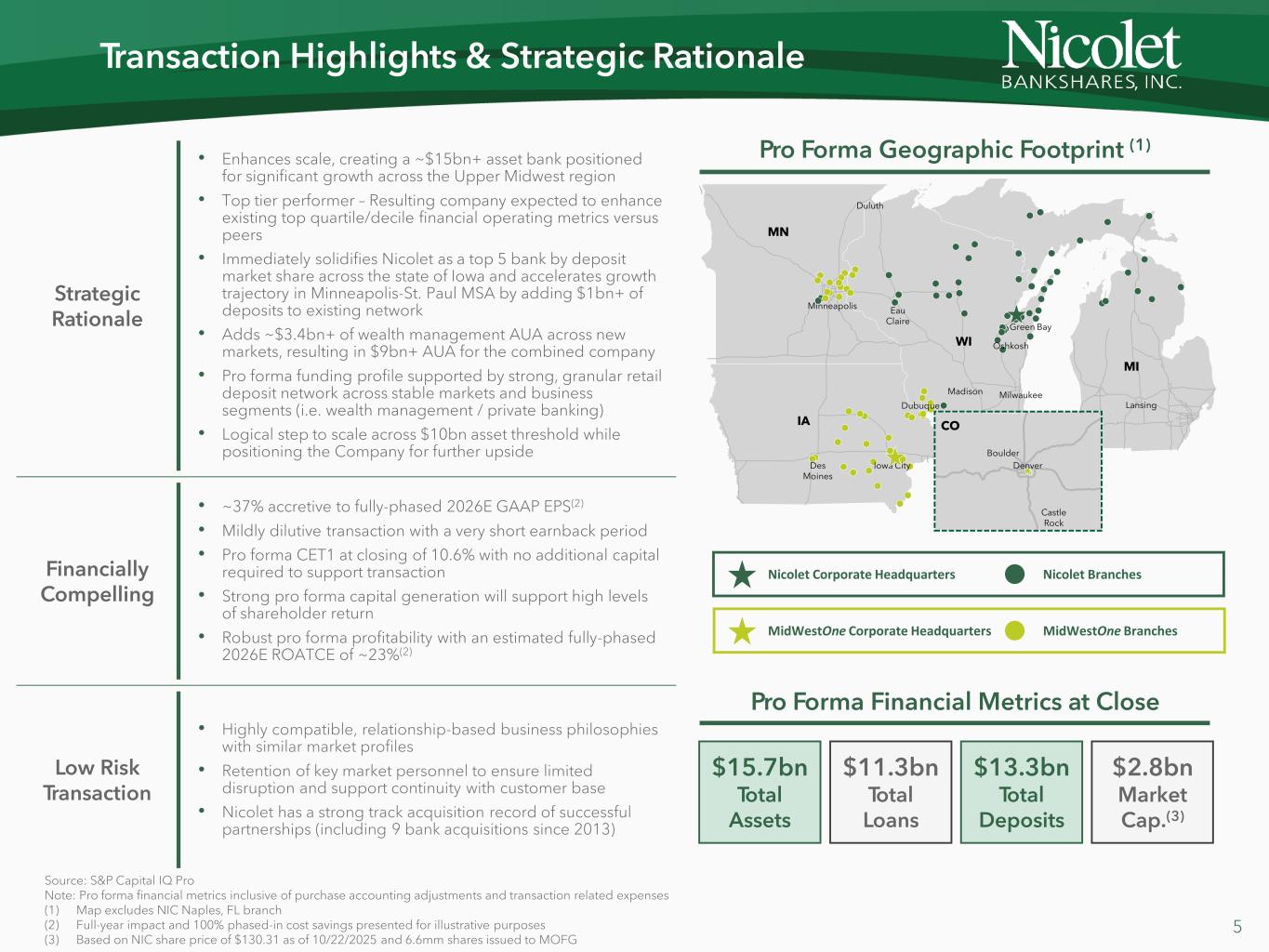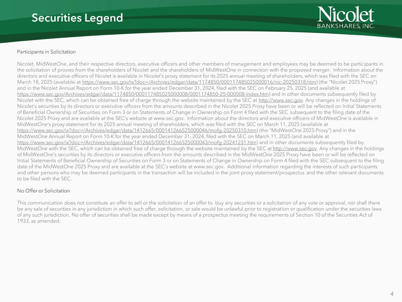 4 Participants in Solicitation Nicolet, MidWestOne, and their respective directors, executive officers and other members of management and employees may be deemed to be participants in the solicitation of proxies from the shareholders of Nicolet and the shareholders of MidWestOne in connection with the proposed merger. Information about the directors and executive officers of Nicolet is available in Nicolet’s proxy statement for its 2025 annual meeting of shareholders, which was filed with the SEC on March 18, 2025 (available at https://www.sec.gov/ix?doc=/Archives/edgar/data/1174850/000117485025000016/nic-20250318.htm) (the “Nicolet 2025 Proxy”) and in the Nicolet Annual Report on Form 10-K for the year ended December 31, 2024, filed with the SEC on February 25, 2025 (and available at https://www.sec.gov/Archives/edgar/data/1174850/000117485025000008/0001174850-25-000008-index.htm) and in other documents subsequently filed by Nicolet with the SEC, which can be obtained free of charge through the website maintained by the SEC at http://www.sec.gov. Any changes in the holdings of Nicolet’s securities by its directors or executive officers from the amounts described in the Nicolet 2025 Proxy have been or will be reflected on Initial Statements of Beneficial Ownership of Securities on Form 3 or on Statements of Change in Ownership on Form 4 filed with the SEC subsequent to the filing date of the Nicolet 2025 Proxy and are available at the SEC’s website at www.sec.gov. Information about the directors and executive officers of MidWestOne is available in MidWestOne’s proxy statement for its 2025 annual meeting of shareholders, which was filed with the SEC on March 11, 2025 (available at https://www.sec.gov/ix?doc=/Archives/edgar/data/1412665/000141266525000046/mofg-20250310.htm) (the “MidWestOne 2025 Proxy”) and in the MidWestOne Annual Report on Form 10-K for the year ended December 31, 2024, filed with the SEC on March 11, 2025 (and available at https://www.sec.gov/ix?doc=/Archives/edgar/data/1412665/000141266525000043/mofg-20241231.htm) and in other documents subsequently filed by MidWestOne with the SEC, which can be obtained free of charge through the website maintained by the SEC at http://www.sec.gov. Any changes in the holdings of MidWestOne’s securities by its directors or executive officers from the amounts described in the MidWestOne 2025 Proxy have been or will be reflected on Initial Statements of Beneficial Ownership of Securities on Form 3 or on Statements of Change in Ownership on Form 4 filed with the SEC subsequent to the filing date of the MidWestOne 2025 Proxy and are available at the SEC’s website at www.sec.gov. Additional information regarding the interests of such participants and other persons who may be deemed participants in the transaction will be included in the joint proxy statement/prospectus and the other relevant documents to be filed with the SEC. No Offer or Solicitation This communication does not constitute an offer to sell or the solicitation of an offer to buy any securities or a solicitation of any vote or approval, nor shall there be any sale of securities in any jurisdiction in which such offer, solicitation, or sale would be unlawful prior to registration or qualification under the securities laws of any such jurisdiction. No offer of securities shall be made except by means of a prospectus meeting the requirements of Section 10 of the Securities Act of 1933, as amended. Securities LegendSecurities Legend