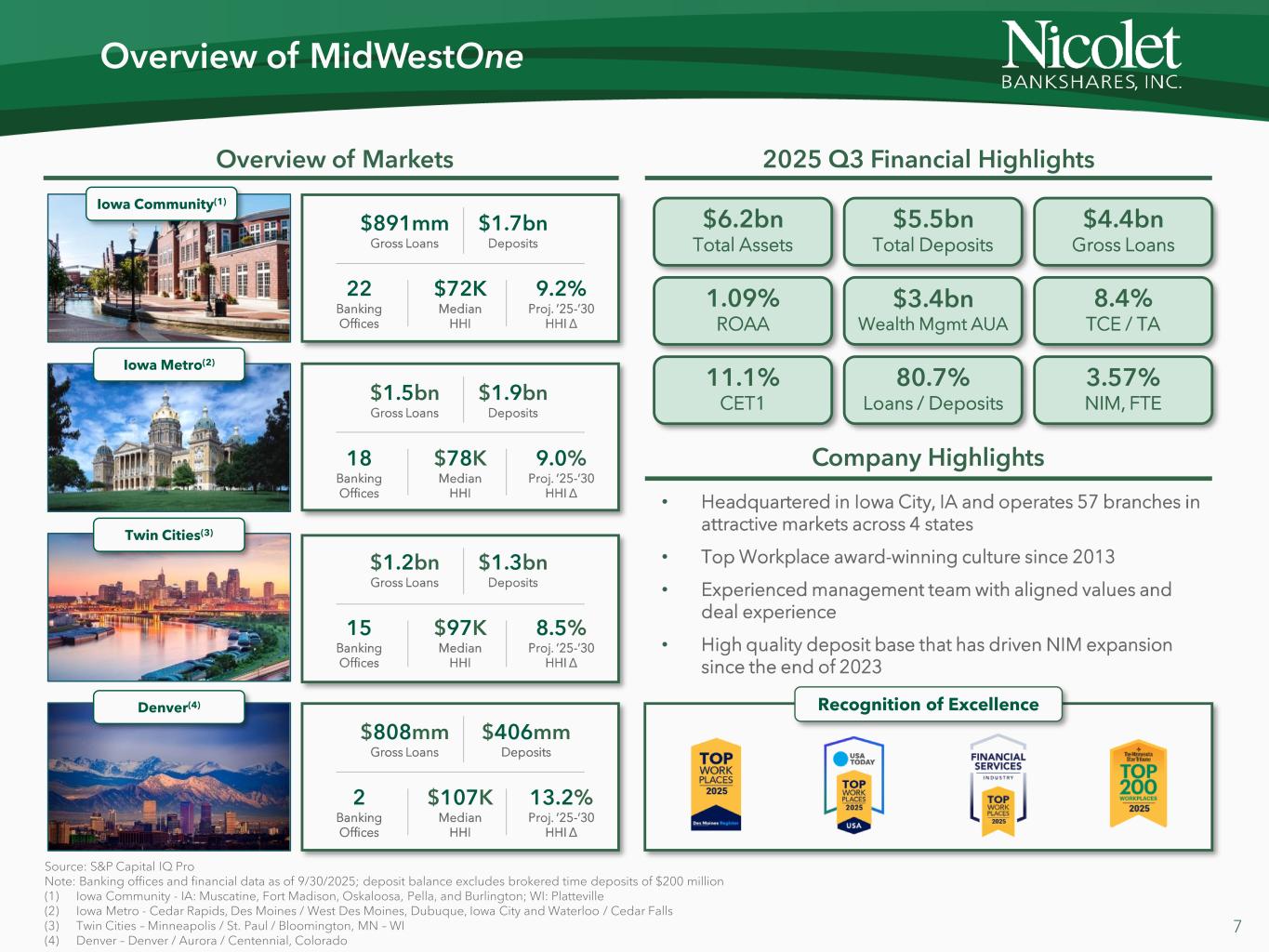 6 Transaction Structure Transaction Value Transaction Multiples Board Representation & Management Approvals & Timing Overview of Nicolet Bankshares, Inc. (1) Based on NIC’s stock price of $130.31 and MOFG’s stock price of $28.50 as of 10/22/2025 (2) Assumes 20,632,760 MOFG common shares outstanding; Assumes 252,475 MOFG RSUs and PSUs are converted to NIC common shares at the exchange ratio (3) Pay-to-Trade calculated as transaction tangible book value multiple divided by the buyer’s standalone tangible book value multiple Transaction Structure • 100% stock consideration • Fixed exchange ratio of 0.3175x NIC shares for each MOFG share • Pro Forma Ownership: 69.1% NIC | 30.9% MOFG • $41.37 per MOFG share(1) • Aggregate Consideration: $864.1 million(2) • Price / 2026E Consensus EPS: 11.5x • Price / TBV: 1.66x • Market Premium: 45.2%(1) • Pay-to-Trade: 71%(3) • Post-closing, the NIC Board will have 12 members; 8 NIC members and 4 MOFG members • NIC executive leadership team remains in place and will be enhanced by key MOFG executives including Chip Reeves, Barry Ray, and other senior leaders • Approvals of NIC and MOFG shareholders required • Customary regulatory approvals • Anticipated closing in the first half of 2026