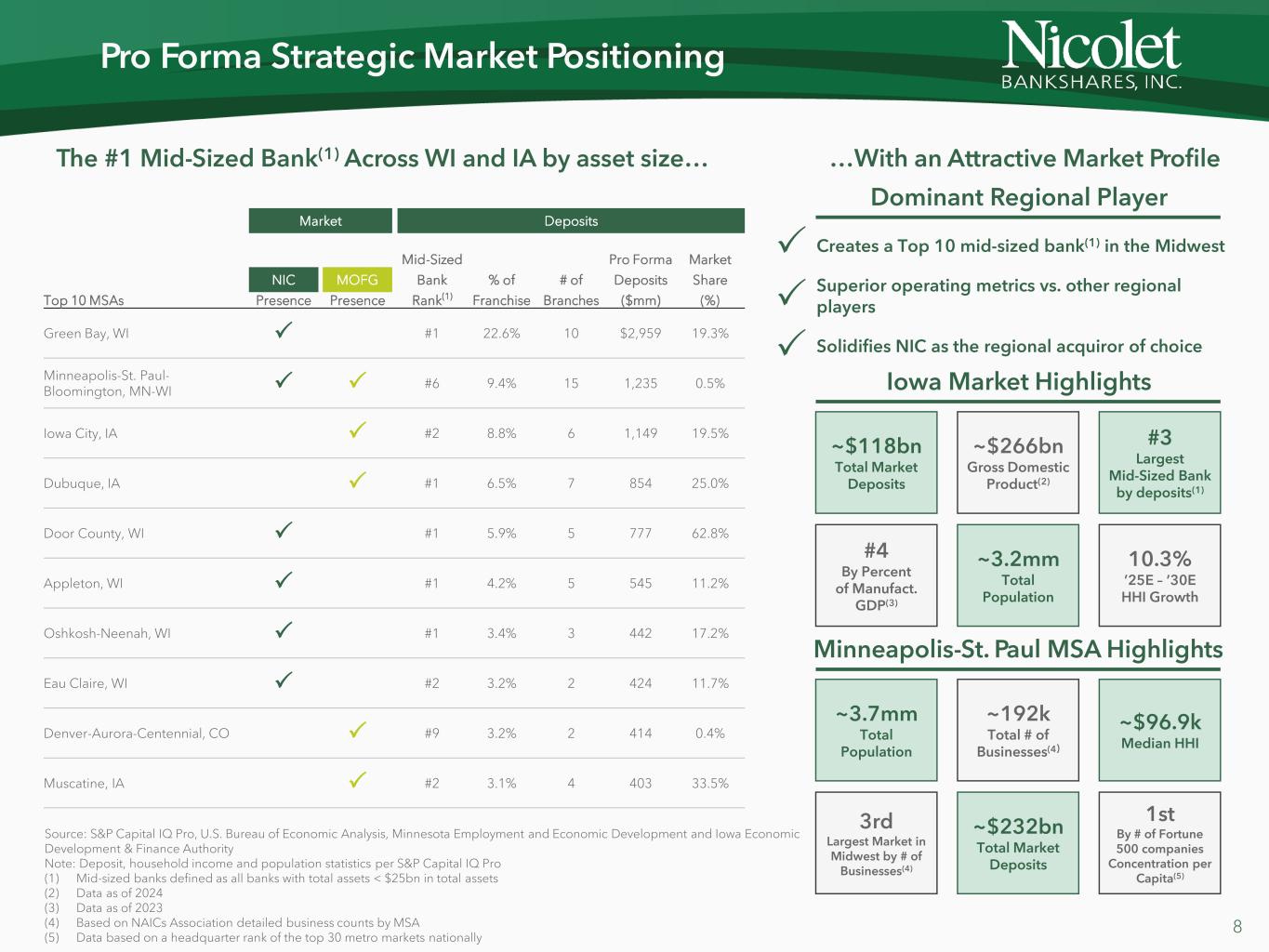 7 $808mm Gross Loans 2 Banking Offices $107K Median HHI 13.2% Proj. ’25-’30 HHI Δ Overview of Nicolet Bankshares, Inc. Source: S&P Capital IQ Pro Note: Banking offices and financial data as of 9/30/2025; deposit balance excludes brokered time deposits of $200 million (1) Iowa Community - IA: Muscatine, Fort Madison, Oskaloosa, Pella, and Burlington; WI: Platteville (2) Iowa Metro - Cedar Rapids, Des Moines / West Des Moines, Dubuque, Iowa City and Waterloo / Cedar Falls (3) Twin Cities – Minneapolis / St. Paul / Bloomington, MN – WI (4) Denver – Denver / Aurora / Centennial, Colorado $6.2bn Total Assets $4.4bn Gross Loans $5.5bn Total Deposits $3.4bn Wealth Mgmt AUA 1.09% ROAA 2025 Q3 Financial Highlights 8.4% TCE / TA 11.1% CET1 80.7% Loans / Deposits 3.57% NIM, FTE Overview of Markets Company Highlights Iowa Community(1) Iowa Metro(2) Twin Cities(3) Denver(4) $1.7bn Deposits $891mm Gross Loans 22 Banking Offices $72K Median HHI 9.2% Proj. ’25-’30 HHI Δ Recognition of Excellence $1.9bn Deposits $1.5bn Gross Loans 18 Banking Offices $78K Median HHI 9.0% Proj. ’25-’30 HHI Δ $1.3bn Deposits $1.2bn Gross Loans 15 Banking Offices $97K Median HHI 8.5% Proj. ’25-’30 HHI Δ • Headquartered in Iowa City, IA and operates 57 branches in attractive markets across 4 states • Top Workplace award-winning culture since 2013 • Experienced management team with aligned values and deal experience • High quality deposit base that has driven NIM expansion since the end of 2023 $406mm Deposits Overview of MidWestOne