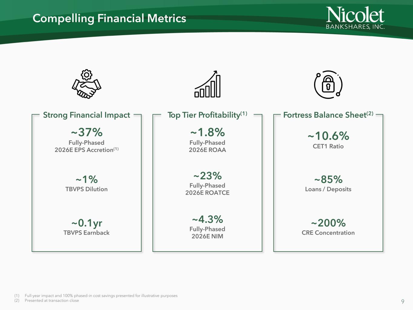 8 Overview of Nicolet Bankshares, Inc. Source: S&P Capital IQ Pro, U.S. Bureau of Economic Analysis, Minnesota Employment and Economic Development and Iowa Economic Development & Finance Authority Note: Deposit, household income and population statistics per S&P Capital IQ Pro (1) Mid-sized banks defined as all banks with total assets < $25bn in total assets (2) Data as of 2024 (3) Data as of 2023 (4) Based on NAICs Association detailed business counts by MSA (5) Data based on a headquarter rank of the top 30 metro markets nationally Pro Forma Strategic Market Positioning The #1 Mid-Sized Bank(1) Across WI and IA by asset size… Market Deposits Mid-Sized Pro Forma Market NIC MOFG Bank % of # of Deposits Share Top 10 MSAs Presence Presence Rank(1) Franchise Branches ($mm) (%) Green Bay, WI  #1 22.6% 10 $2,959 19.3% Minneapolis-St. Paul- Bloomington, MN-WI   #6 9.4% 15 1,235 0.5% Iowa City, IA  #2 8.8% 6 1,149 19.5% Dubuque, IA  #1 6.5% 7 854 25.0% Door County, WI  #1 5.9% 5 777 62.8% Appleton, WI  #1 4.2% 5 545 11.2% Oshkosh-Neenah, WI  #1 3.4% 3 442 17.2% Eau Claire, WI  #2 3.2% 2 424 11.7% Denver-Aurora-Centennial, CO  #9 3.2% 2 414 0.4% Muscatine, IA  #2 3.1% 4 403 33.5% …With an Attractive Market Profile ~$118bn Total Market Deposits ~$266bn Gross Domestic Product(2) #3 Largest Mid-Sized Bank by deposits(1) Iowa Market Highlights #4 By Percent of Manufact. GDP(3) ~3.2mm Total Population 10.3% ’25E – ’30E HHI Growth ~3.7mm Total Population ~192k Total # of Businesses(4) ~$96.9k Median HHI Minneapolis-St. Paul MSA Highlights 3rd Largest Market in Midwest by # of Businesses(4) ~$232bn Total Market Deposits 1st By # of Fortune 500 companies Concentration per Capita(5) Dominant Regional Player Creates a Top 10 mid-sized bank(1) in the Midwest Superior operating metrics vs. other regional players Solidifies NIC as the regional acquiror of choice   