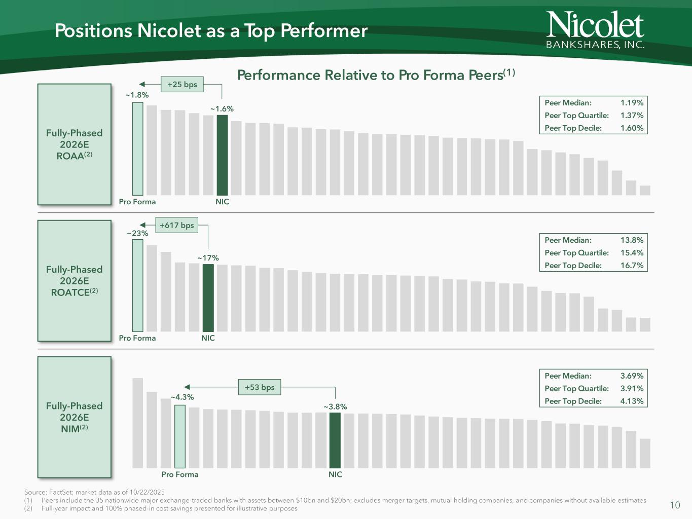 9 Overview of Nicolet Bankshares, Inc. (1) Full-year impact and 100% phased-in cost savings presented for illustrative purposes (2) Presented at transaction close Strong Financial Impact Top Tier Profitability(1) Fortress Balance Sheet(2) ~37% Fully-Phased 2026E EPS Accretion(1) ~1% TBVPS Dilution ~1.8% Fully-Phased 2026E ROAA ~23% Fully-Phased 2026E ROATCE ~10.6% CET1 Ratio ~85% Loans / Deposits ~4.3% Fully-Phased 2026E NIM Compelling Financial Metrics ~200% CRE Concentration ~0.1yr TBVPS Earnback