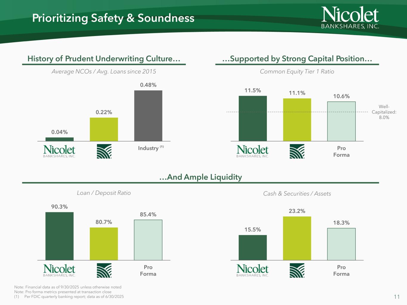 10 Overview of Nicolet Bankshares, Inc.Positions Nicolet as a Top Performer Performance Relative to Pro Forma Peers(1) Fully-Phased 2026E ROAA(2) Fully-Phased 2026E ROATCE(2) Fully-Phased 2026E NIM(2) Source: FactSet; market data as of 10/22/2025 (1) Peers include the 35 nationwide major exchange-traded banks with assets between $10bn and $20bn; excludes merger targets, mutual holding companies, and companies without available estimates (2) Full-year impact and 100% phased-in cost savings presented for illustrative purposes +25 bps +617 bps +53 bps ~1.6% ~1.8% ~17% ~23% ~3.8% ~4.3% NICPro Forma NICPro Forma NICPro Forma Peer Median: 1.19% Peer Top Quartile: 1.37% Peer Top Decile: 1.60% Peer Median: 13.8% Peer Top Quartile: 15.4% Peer Top Decile: 16.7% Peer Median: 3.69% Peer Top Quartile: 3.91% Peer Top Decile: 4.13%