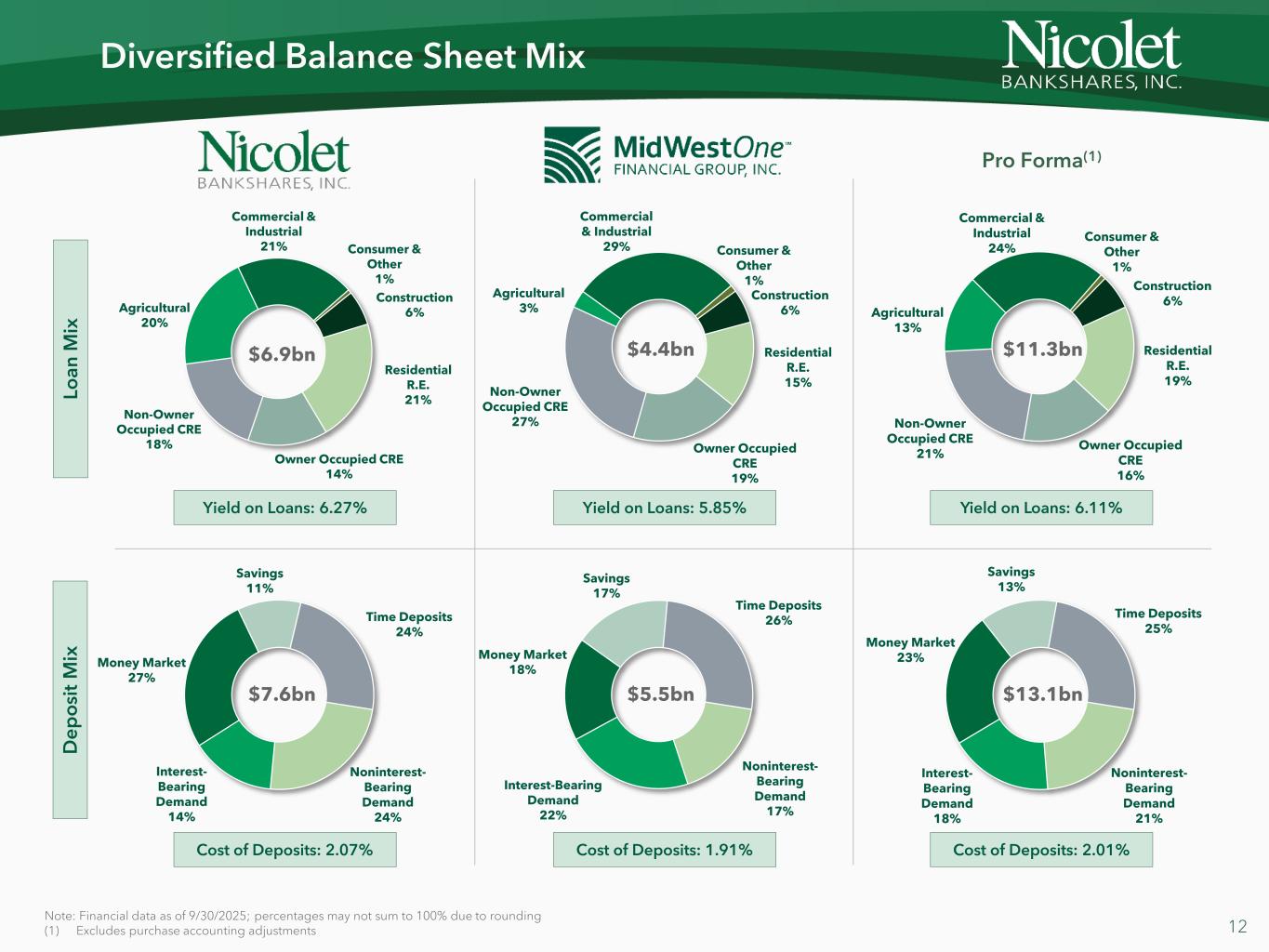 11 15.5% 23.2% 18.3% Pro Forma 11.5% 11.1% 10.6% Pro Forma 90.3% 80.7% 85.4% Pro Forma 0.04% 0.22% 0.48% Industry Overview of Nicolet Bankshares, Inc.Prioritizing Safety & Soundness History of Prudent Underwriting Culture… …Supported by Strong Capital Position… …And Ample Liquidity Common Equity Tier 1 RatioAverage NCOs / Avg. Loans since 2015 Loan / Deposit Ratio Cash & Securities / Assets Well- Capitalized: 8.0% (1) Note: Financial data as of 9/30/2025 unless otherwise noted Note: Pro forma metrics presented at transaction close (1) Per FDIC quarterly banking report; data as of 6/30/2025