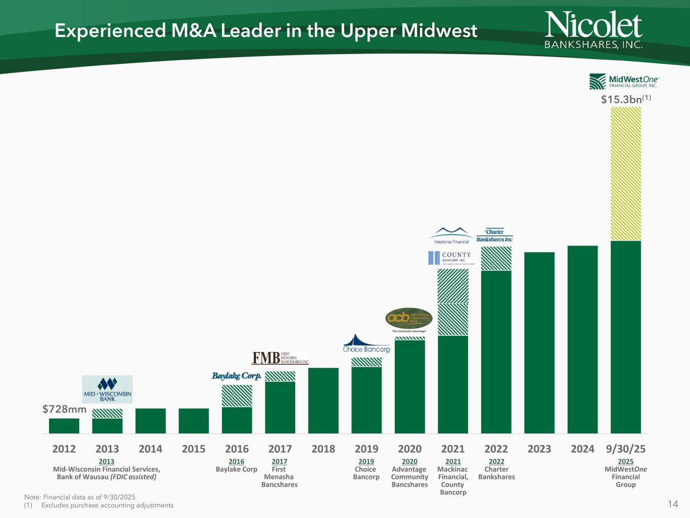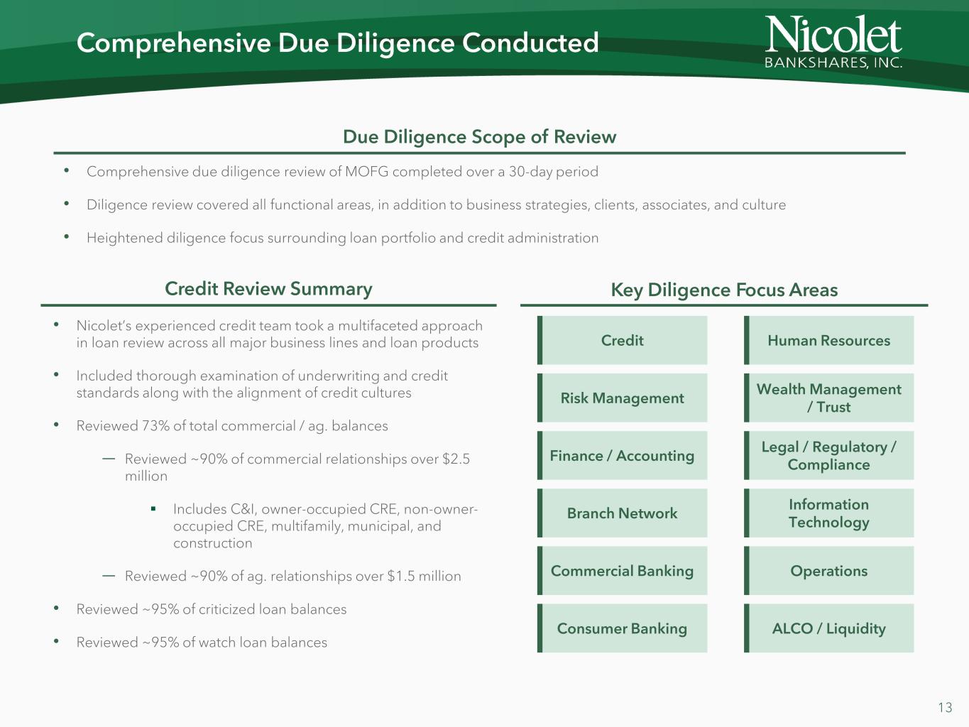 12 Construction 6% Residential R.E. 21% Owner Occupied CRE 14% Non-Owner Occupied CRE 18% Agricultural 20% Commercial & Industrial 21% Consumer & Other 1% Construction 6% Residential R.E. 19% Owner Occupied CRE 16% Non-Owner Occupied CRE 21% Agricultural 13% Commercial & Industrial 24% Consumer & Other 1% Construction 6% Residential R.E. 15% Owner Occupied CRE 19% Non-Owner Occupied CRE 27% Agricultural 3% Commercial & Industrial 29% Consumer & Other 1% Noninterest- Bearing Demand 21% Interest- Bearing Demand 18% Money Market 23% Savings 13% Time Deposits 25% Noninterest- Bearing Demand 17% Interest-Bearing Demand 22% Money Market 18% Savings 17% Time Deposits 26% Noninterest- Bearing Demand 24% Interest- Bearing Demand 14% Money Market 27% Savings 11% Time Deposits 24% Overview of Nicolet Bankshares, Inc. Note: Financial data as of 9/30/2025; percentages may not sum to 100% due to rounding (1) Excludes purchase accounting adjustments Diversified Balance Sheet Mix $7.6bn Pro Forma(1) L o a n M ix Yield on Loans: 6.27% $6.9bn $11.3bn Yield on Loans: 6.11% D e p o si t M ix Cost of Deposits: 2.07% $13.1bn Cost of Deposits: 2.01% Yield on Loans: 5.85% Cost of Deposits: 1.91% $4.4bn $5.5bn