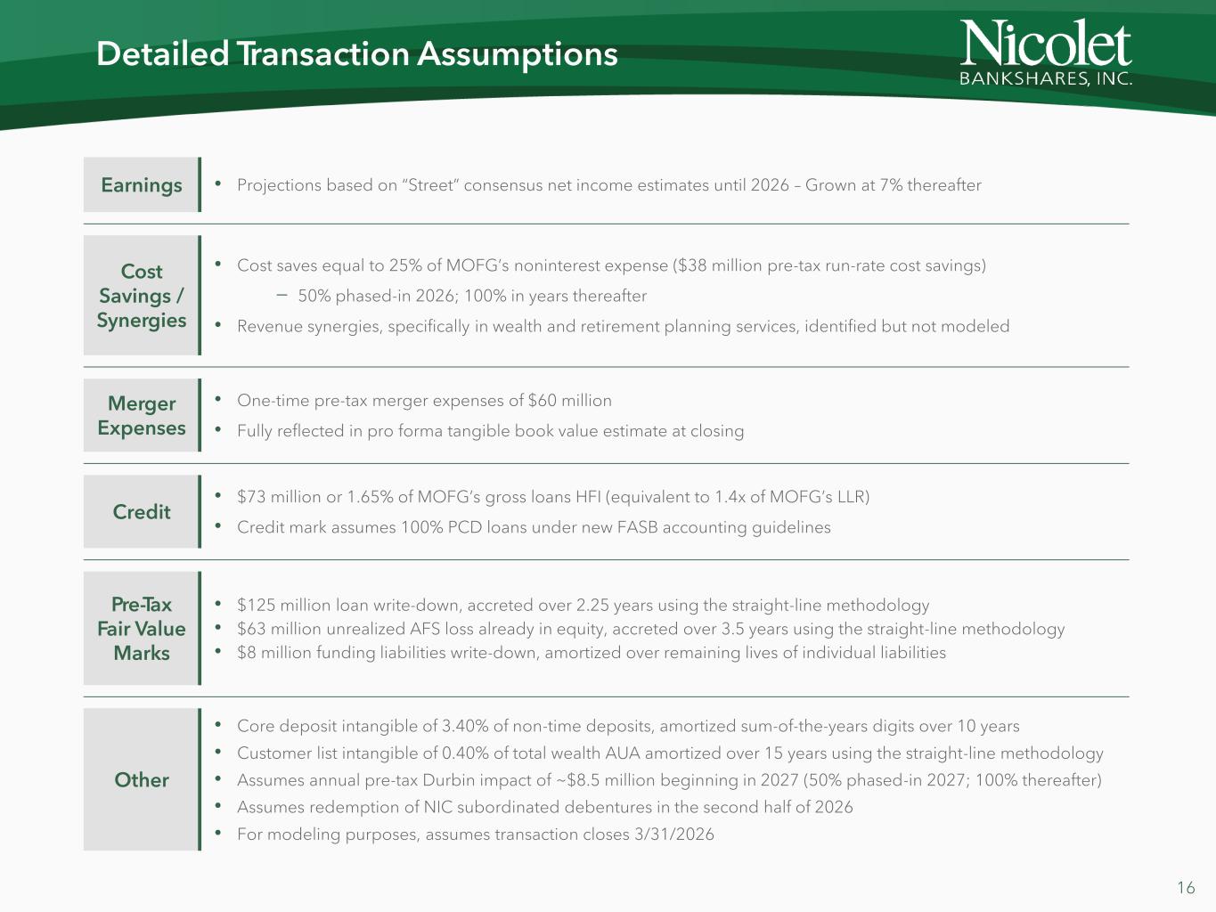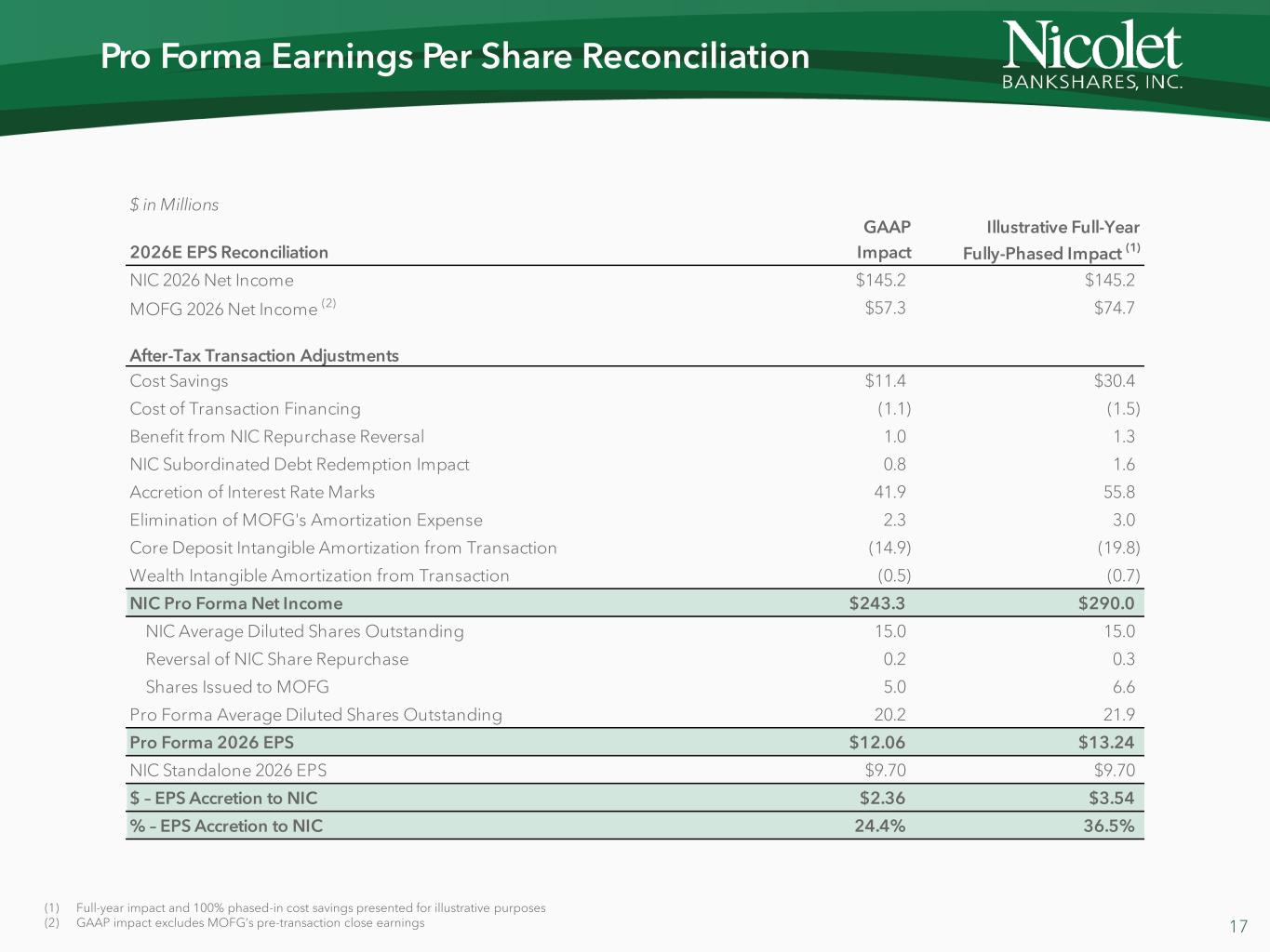 16 Overview of Nicolet Bankshares, Inc.Detailed Transaction Assumptions Earnings Cost Savings / Synergies Merger Expenses Credit Pre-Tax Fair Value Marks Other • Projections based on “Street” consensus net income estimates until 2026 – Grown at 7% thereafter • Cost saves equal to 25% of MOFG’s noninterest expense ($38 million pre-tax run-rate cost savings) − 50% phased-in 2026; 100% in years thereafter • Revenue synergies, specifically in wealth and retirement planning services, identified but not modeled • One-time pre-tax merger expenses of $60 million • Fully reflected in pro forma tangible book value estimate at closing • $73 million or 1.65% of MOFG’s gross loans HFI (equivalent to 1.4x of MOFG’s LLR) • Credit mark assumes 100% PCD loans under new FASB accounting guidelines • $125 million loan write-down, accreted over 2.25 years using the straight-line methodology • $63 million unrealized AFS loss already in equity, accreted over 3.5 years using the straight-line methodology • $8 million funding liabilities write-down, amortized over remaining lives of individual liabilities • Core deposit intangible of 3.40% of non-time deposits, amortized sum-of-the-years digits over 10 years • Customer list intangible of 0.40% of total wealth AUA amortized over 15 years using the straight-line methodology • Assumes annual pre-tax Durbin impact of ~$8.5 million beginning in 2027 (50% phased-in 2027; 100% thereafter) • Assumes redemption of NIC subordinated debentures in the second half of 2026 • For modeling purposes, assumes transaction closes 3/31/2026
