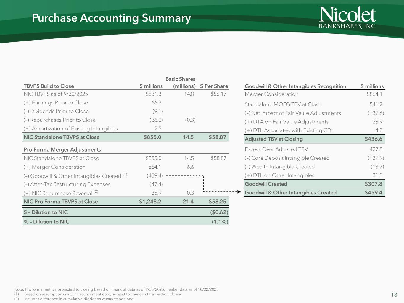 17 Overview of Nicolet Bankshares, Inc.Pro Forma Earnings Per Share Reconciliation (1) Full-year impact and 100% phased-in cost savings presented for illustrative purposes (2) GAAP impact excludes MOFG’s pre-transaction close earnings $ in Millions GAAP Illustrative Full-Year 2026E EPS Reconciliation Impact Fully-Phased Impact (1) NIC 2026 Net Income $145.2 $145.2 MOFG 2026 Net Income (2) $57.3 $74.7 After-Tax Transaction Adjustments Cost Savings $11.4 $30.4 Cost of Transaction Financing (1.1) (1.5) Benefit from NIC Repurchase Reversal 1.0 1.3 NIC Subordinated Debt Redemption Impact 0.8 1.6 Accretion of Interest Rate Marks 41.9 55.8 Elimination of MOFG's Amortization Expense 2.3 3.0 Core Deposit Intangible Amortization from Transaction (14.9) (19.8) Wealth Intangible Amortization from Transaction (0.5) (0.7) NIC Pro Forma Net Income $243.3 $290.0 NIC Average Diluted Shares Outstanding 15.0 15.0 Reversal of NIC Share Repurchase 0.2 0.3 Shares Issued to MOFG 5.0 6.6 Pro Forma Average Diluted Shares Outstanding 20.2 21.9 Pro Forma 2026 EPS $12.06 $13.24 NIC Standalone 2026 EPS $9.70 $9.70 $ – EPS Accretion to NIC $2.36 $3.54 % – EPS Accretion to NIC 24.4% 36.5%