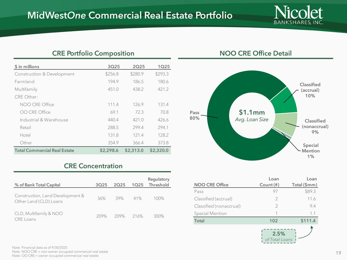 19 Overview of Nicolet Bankshares, Inc.MidWestOne Commercial Real Estate Portfolio NOO CRE Office DetailCRE Portfolio Composition CRE Concentration % of Bank Total Capital 3Q25 2Q25 1Q25 Regulatory Threshold Construction, Land Development & Other Land (CLD) Loans 36% 39% 41% 100% CLD, Multifamily & NOO CRE Loans 209% 209% 216% 300% Classified (accrual) 10% Classified (nonaccrual) 9% Special Mention 1% Pass 80% $1.1mm Avg. Loan Size NOO CRE Office Loan Count (#) Loan Total ($mm) Pass 97 $89.3 Classified (accrual) 2 11.6 Classified (nonaccrual) 2 9.4 Special Mention 1 1.1 Total 102 $111.4 $ in millions 3Q25 2Q25 1Q25 Construction & Development $256.8 $280.9 $293.3 Farmland 194.9 186.5 180.6 Multifamily 451.0 438.2 421.2 CRE Other: NOO CRE Office 111.4 126.9 131.4 OO CRE Office 69.1 72.3 70.8 Industrial & Warehouse 440.4 421.0 426.6 Retail 288.5 299.4 294.1 Hotel 131.8 121.4 128.2 Other 354.9 366.4 373.8 Total Commercial Real Estate $2,298.6 $2,313.0 $2,320.0 2.5% of Total Loans Note: Financial data as of 9/30/2025 Note: NOO CRE = non-owner occupied commercial real estate Note: OO CRE = owner occupied commercial real estate