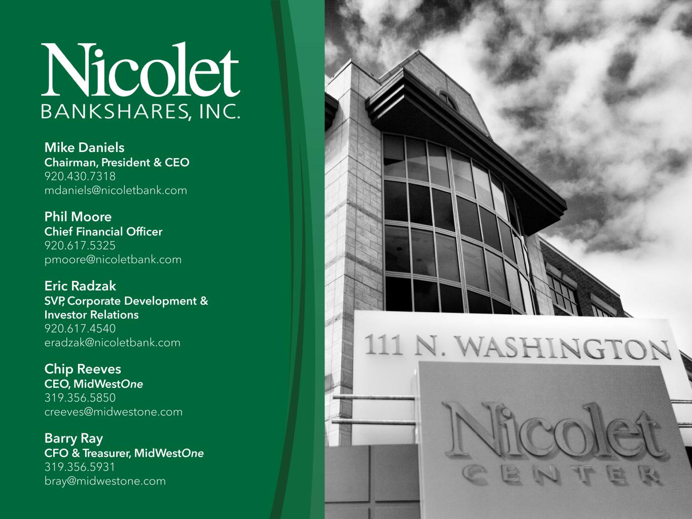 20 b Mike Daniels Chairman, President & CEO 920.430.7318 mdaniels@nicoletbank.com Phil Moore Chief Financial Officer 920.617.5325 pmoore@nicoletbank.com Eric Radzak SVP, Corporate Development & Investor Relations 920.617.4540 eradzak@nicoletbank.com Chip Reeves CEO, MidWestOne 319.356.5850 creeves@midwestone.com Barry Ray CFO & Treasurer, MidWestOne 319.356.5931 bray@midwestone.com