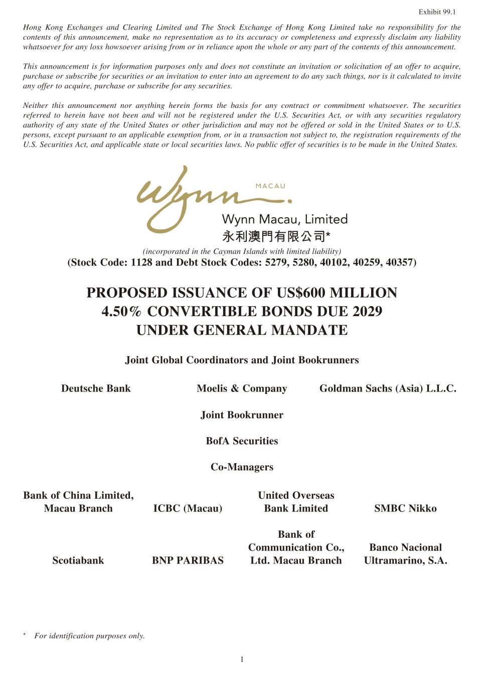 1 * For identification purposes only. Hong Kong Exchanges and Clearing Limited and The Stock Exchange of Hong Kong Limited take no responsibility for the contents of this announcement, make no representation as to its accuracy or completeness and expressly disclaim any liability whatsoever for any loss howsoever arising from or in reliance upon the whole or any part of the contents of this announcement. This announcement is for information purposes only and does not constitute an invitation or solicitation of an offer to acquire, purchase or subscribe for securities or an invitation to enter into an agreement to do any such things, nor is it calculated to invite any offer to acquire, purchase or subscribe for any securities. Neither this announcement nor anything herein forms the basis for any contract or commitment whatsoever. The securities referred to herein have not been and will not be registered under the U.S. Securities Act, or with any securities regulatory authority of any state of the United States or other jurisdiction and may not be offered or sold in the United States or to U.S. persons, except pursuant to an applicable exemption from, or in a transaction not subject to, the registration requirements of the U.S. Securities Act, and applicable state or local securities laws. No public offer of securities is to be made in the United States. (incorporated in the Cayman Islands with limited liability) (Stock Code: 1128 and Debt Stock Codes: 5279, 5280, 40102, 40259, 40357) PROPOSED ISSUANCE OF US$600 MILLION 4.50% CONVERTIBLE BONDS DUE 2029 UNDER GENERAL MANDATE Joint Global Coordinators and Joint Bookrunners Deutsche Bank Moelis & Company Goldman Sachs (Asia) L.L.C. Joint Bookrunner BofA Securities Co-Managers Bank of China Limited, Macau Branch ICBC (Macau) United Overseas Bank Limited SMBC Nikko Scotiabank BNP PARIBAS Bank of Communication Co., Ltd. Macau Branch Banco Nacional Ultramarino, S.A. Exhibit 99.1
