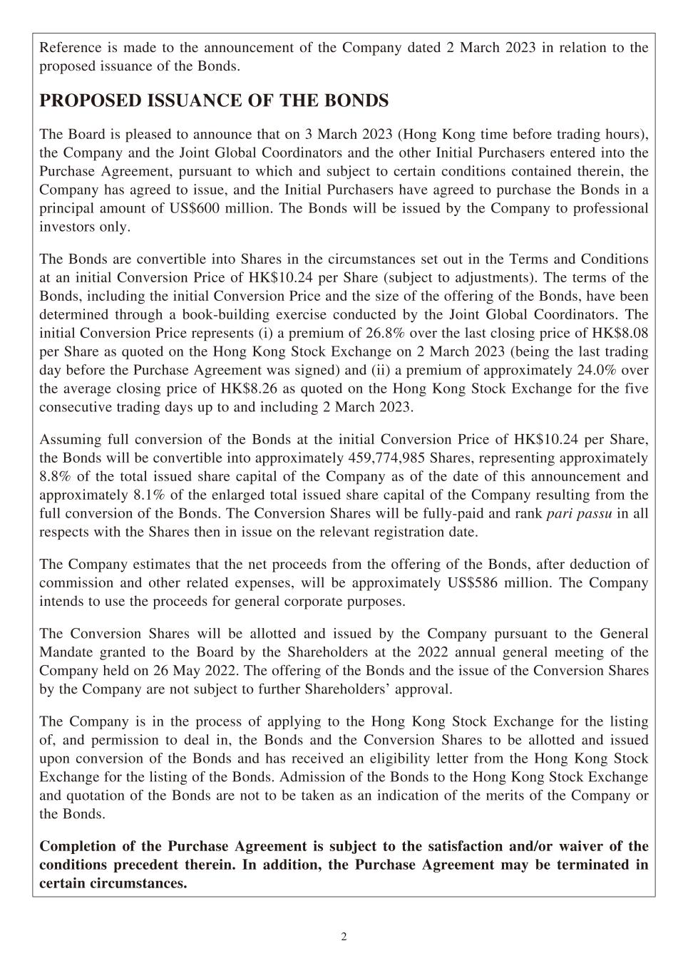 2 Reference is made to the announcement of the Company dated 2 March 2023 in relation to the proposed issuance of the Bonds. PROPOSED ISSUANCE OF THE BONDS The Board is pleased to announce that on 3 March 2023 (Hong Kong time before trading hours), the Company and the Joint Global Coordinators and the other Initial Purchasers entered into the Purchase Agreement, pursuant to which and subject to certain conditions contained therein, the Company has agreed to issue, and the Initial Purchasers have agreed to purchase the Bonds in a principal amount of US$600 million. The Bonds will be issued by the Company to professional investors only. The Bonds are convertible into Shares in the circumstances set out in the Terms and Conditions at an initial Conversion Price of HK$10.24 per Share (subject to adjustments). The terms of the Bonds, including the initial Conversion Price and the size of the offering of the Bonds, have been determined through a book-building exercise conducted by the Joint Global Coordinators. The initial Conversion Price represents (i) a premium of 26.8% over the last closing price of HK$8.08 per Share as quoted on the Hong Kong Stock Exchange on 2 March 2023 (being the last trading day before the Purchase Agreement was signed) and (ii) a premium of approximately 24.0% over the average closing price of HK$8.26 as quoted on the Hong Kong Stock Exchange for the five consecutive trading days up to and including 2 March 2023. Assuming full conversion of the Bonds at the initial Conversion Price of HK$10.24 per Share, the Bonds will be convertible into approximately 459,774,985 Shares, representing approximately 8.8% of the total issued share capital of the Company as of the date of this announcement and approximately 8.1% of the enlarged total issued share capital of the Company resulting from the full conversion of the Bonds. The Conversion Shares will be fully-paid and rank pari passu in all respects with the Shares then in issue on the relevant registration date. The Company estimates that the net proceeds from the offering of the Bonds, after deduction of commission and other related expenses, will be approximately US$586 million. The Company intends to use the proceeds for general corporate purposes. The Conversion Shares will be allotted and issued by the Company pursuant to the General Mandate granted to the Board by the Shareholders at the 2022 annual general meeting of the Company held on 26 May 2022. The offering of the Bonds and the issue of the Conversion Shares by the Company are not subject to further Shareholders’ approval. The Company is in the process of applying to the Hong Kong Stock Exchange for the listing of, and permission to deal in, the Bonds and the Conversion Shares to be allotted and issued upon conversion of the Bonds and has received an eligibility letter from the Hong Kong Stock Exchange for the listing of the Bonds. Admission of the Bonds to the Hong Kong Stock Exchange and quotation of the Bonds are not to be taken as an indication of the merits of the Company or the Bonds. Completion of the Purchase Agreement is subject to the satisfaction and/or waiver of the conditions precedent therein. In addition, the Purchase Agreement may be terminated in certain circumstances.