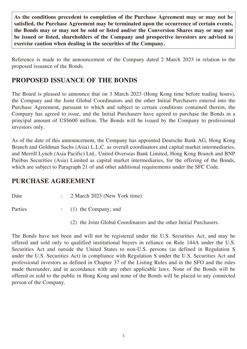 3 As the conditions precedent to completion of the Purchase Agreement may or may not be satisfied, the Purchase Agreement may be terminated upon the occurrence of certain events, the Bonds may or may not be sold or listed and/or the Conversion Shares may or may not be issued or listed, shareholders of the Company and prospective investors are advised to exercise caution when dealing in the securities of the Company. Reference is made to the announcement of the Company dated 2 March 2023 in relation to the proposed issuance of the Bonds. PROPOSED ISSUANCE OF THE BONDS The Board is pleased to announce that on 3 March 2023 (Hong Kong time before trading hours), the Company and the Joint Global Coordinators and the other Initial Purchasers entered into the Purchase Agreement, pursuant to which and subject to certain conditions contained therein, the Company has agreed to issue, and the Initial Purchasers have agreed to purchase the Bonds in a principal amount of US$600 million. The Bonds will be issued by the Company to professional investors only. As of the date of this announcement, the Company has appointed Deutsche Bank AG, Hong Kong Branch and Goldman Sachs (Asia) L.L.C. as overall coordinators and capital market intermediaries, and Merrill Lynch (Asia Pacific) Ltd., United Overseas Bank Limited, Hong Kong Branch and BNP Paribas Securities (Asia) Limited as capital market intermediaries, for the offering of the Bonds, which are subject to Paragraph 21 of and other additional requirements under the SFC Code. PURCHASE AGREEMENT Date : 2 March 2023 (New York time) Parties : (1) the Company; and (2) the Joint Global Coordinators and the other Initial Purchasers. The Bonds have not been and will not be registered under the U.S. Securities Act, and may be offered and sold only to qualified institutional buyers in reliance on Rule 144A under the U.S. Securities Act and outside the United States to non-U.S. persons (as defined in Regulation S under the U.S. Securities Act) in compliance with Regulation S under the U.S. Securities Act and professional investors as defined in Chapter 37 of the Listing Rules and in the SFO and the rules made thereunder, and in accordance with any other applicable laws. None of the Bonds will be offered or sold to the public in Hong Kong and none of the Bonds will be placed to any connected person of the Company.