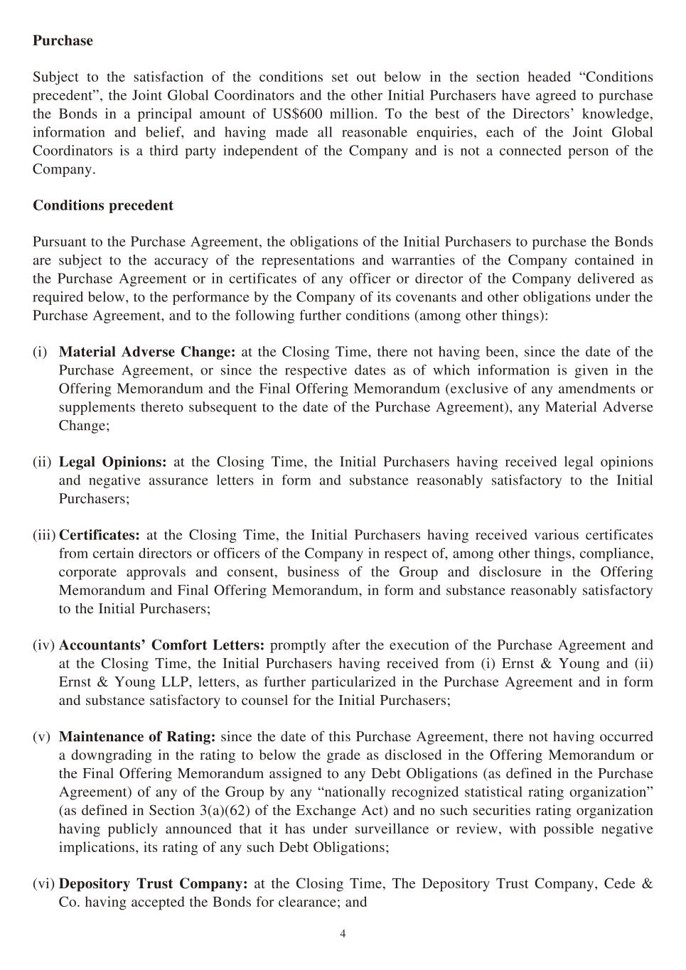 4 Purchase Subject to the satisfaction of the conditions set out below in the section headed “Conditions precedent”, the Joint Global Coordinators and the other Initial Purchasers have agreed to purchase the Bonds in a principal amount of US$600 million. To the best of the Directors’ knowledge, information and belief, and having made all reasonable enquiries, each of the Joint Global Coordinators is a third party independent of the Company and is not a connected person of the Company. Conditions precedent Pursuant to the Purchase Agreement, the obligations of the Initial Purchasers to purchase the Bonds are subject to the accuracy of the representations and warranties of the Company contained in the Purchase Agreement or in certificates of any officer or director of the Company delivered as required below, to the performance by the Company of its covenants and other obligations under the Purchase Agreement, and to the following further conditions (among other things): (i) Material Adverse Change: at the Closing Time, there not having been, since the date of the Purchase Agreement, or since the respective dates as of which information is given in the Offering Memorandum and the Final Offering Memorandum (exclusive of any amendments or supplements thereto subsequent to the date of the Purchase Agreement), any Material Adverse Change; (ii) Legal Opinions: at the Closing Time, the Initial Purchasers having received legal opinions and negative assurance letters in form and substance reasonably satisfactory to the Initial Purchasers; (iii) Certificates: at the Closing Time, the Initial Purchasers having received various certificates from certain directors or officers of the Company in respect of, among other things, compliance, corporate approvals and consent, business of the Group and disclosure in the Offering Memorandum and Final Offering Memorandum, in form and substance reasonably satisfactory to the Initial Purchasers; (iv) Accountants’ Comfort Letters: promptly after the execution of the Purchase Agreement and at the Closing Time, the Initial Purchasers having received from (i) Ernst & Young and (ii) Ernst & Young LLP, letters, as further particularized in the Purchase Agreement and in form and substance satisfactory to counsel for the Initial Purchasers; (v) Maintenance of Rating: since the date of this Purchase Agreement, there not having occurred a downgrading in the rating to below the grade as disclosed in the Offering Memorandum or the Final Offering Memorandum assigned to any Debt Obligations (as defined in the Purchase Agreement) of any of the Group by any “nationally recognized statistical rating organization” (as defined in Section 3(a)(62) of the Exchange Act) and no such securities rating organization having publicly announced that it has under surveillance or review, with possible negative implications, its rating of any such Debt Obligations; (vi) Depository Trust Company: at the Closing Time, The Depository Trust Company, Cede & Co. having accepted the Bonds for clearance; and
