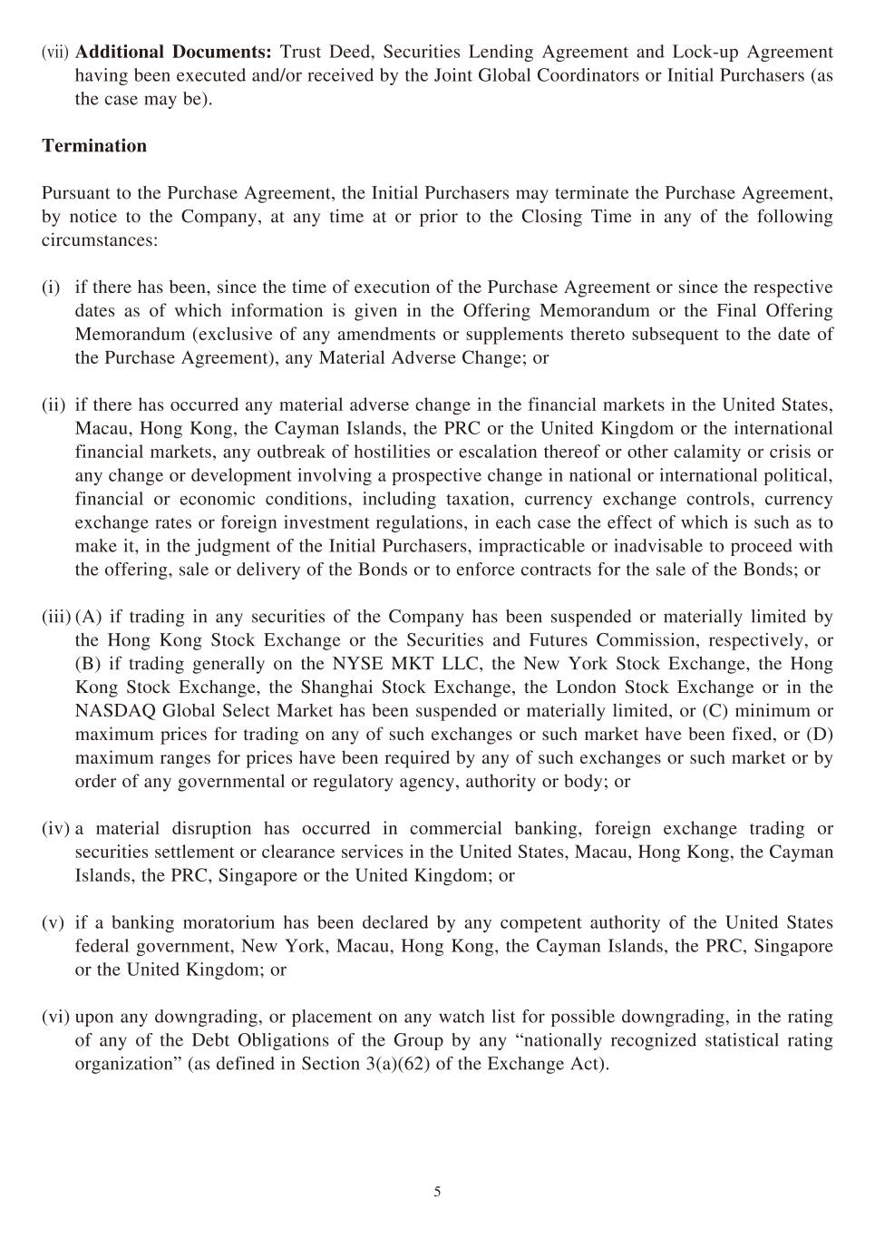 5 (vii) Additional Documents: Trust Deed, Securities Lending Agreement and Lock-up Agreement having been executed and/or received by the Joint Global Coordinators or Initial Purchasers (as the case may be). Termination Pursuant to the Purchase Agreement, the Initial Purchasers may terminate the Purchase Agreement, by notice to the Company, at any time at or prior to the Closing Time in any of the following circumstances: (i) if there has been, since the time of execution of the Purchase Agreement or since the respective dates as of which information is given in the Offering Memorandum or the Final Offering Memorandum (exclusive of any amendments or supplements thereto subsequent to the date of the Purchase Agreement), any Material Adverse Change; or (ii) if there has occurred any material adverse change in the financial markets in the United States, Macau, Hong Kong, the Cayman Islands, the PRC or the United Kingdom or the international financial markets, any outbreak of hostilities or escalation thereof or other calamity or crisis or any change or development involving a prospective change in national or international political, financial or economic conditions, including taxation, currency exchange controls, currency exchange rates or foreign investment regulations, in each case the effect of which is such as to make it, in the judgment of the Initial Purchasers, impracticable or inadvisable to proceed with the offering, sale or delivery of the Bonds or to enforce contracts for the sale of the Bonds; or (iii) (A) if trading in any securities of the Company has been suspended or materially limited by the Hong Kong Stock Exchange or the Securities and Futures Commission, respectively, or (B) if trading generally on the NYSE MKT LLC, the New York Stock Exchange, the Hong Kong Stock Exchange, the Shanghai Stock Exchange, the London Stock Exchange or in the NASDAQ Global Select Market has been suspended or materially limited, or (C) minimum or maximum prices for trading on any of such exchanges or such market have been fixed, or (D) maximum ranges for prices have been required by any of such exchanges or such market or by order of any governmental or regulatory agency, authority or body; or (iv) a material disruption has occurred in commercial banking, foreign exchange trading or securities settlement or clearance services in the United States, Macau, Hong Kong, the Cayman Islands, the PRC, Singapore or the United Kingdom; or (v) if a banking moratorium has been declared by any competent authority of the United States federal government, New York, Macau, Hong Kong, the Cayman Islands, the PRC, Singapore or the United Kingdom; or (vi) upon any downgrading, or placement on any watch list for possible downgrading, in the rating of any of the Debt Obligations of the Group by any “nationally recognized statistical rating organization” (as defined in Section 3(a)(62) of the Exchange Act).