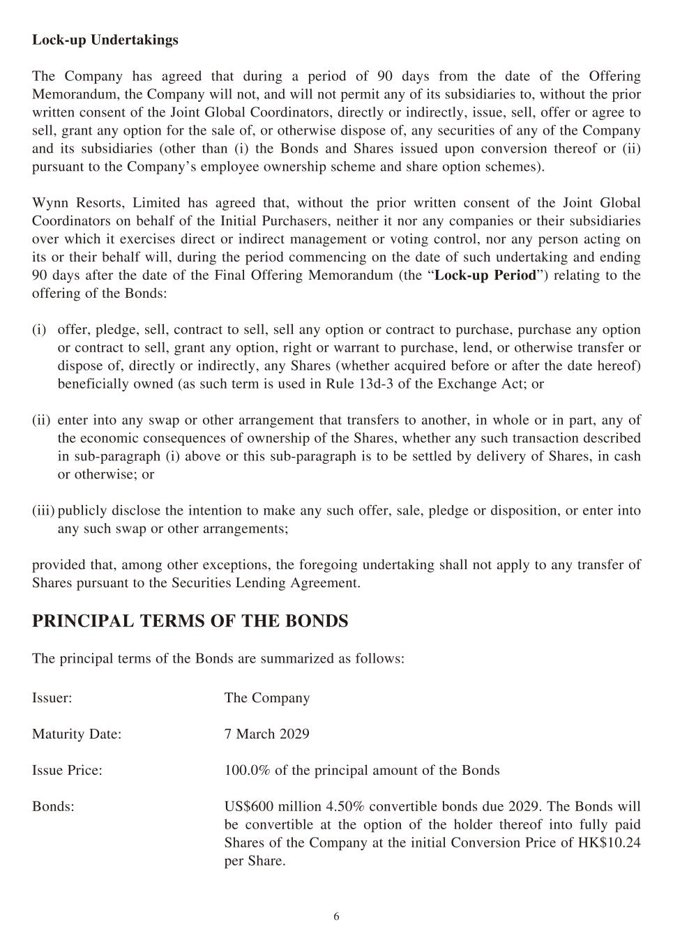 6 Lock-up Undertakings The Company has agreed that during a period of 90 days from the date of the Offering Memorandum, the Company will not, and will not permit any of its subsidiaries to, without the prior written consent of the Joint Global Coordinators, directly or indirectly, issue, sell, offer or agree to sell, grant any option for the sale of, or otherwise dispose of, any securities of any of the Company and its subsidiaries (other than (i) the Bonds and Shares issued upon conversion thereof or (ii) pursuant to the Company’s employee ownership scheme and share option schemes). Wynn Resorts, Limited has agreed that, without the prior written consent of the Joint Global Coordinators on behalf of the Initial Purchasers, neither it nor any companies or their subsidiaries over which it exercises direct or indirect management or voting control, nor any person acting on its or their behalf will, during the period commencing on the date of such undertaking and ending 90 days after the date of the Final Offering Memorandum (the “Lock-up Period”) relating to the offering of the Bonds: (i) offer, pledge, sell, contract to sell, sell any option or contract to purchase, purchase any option or contract to sell, grant any option, right or warrant to purchase, lend, or otherwise transfer or dispose of, directly or indirectly, any Shares (whether acquired before or after the date hereof) beneficially owned (as such term is used in Rule 13d-3 of the Exchange Act; or (ii) enter into any swap or other arrangement that transfers to another, in whole or in part, any of the economic consequences of ownership of the Shares, whether any such transaction described in sub-paragraph (i) above or this sub-paragraph is to be settled by delivery of Shares, in cash or otherwise; or (iii) publicly disclose the intention to make any such offer, sale, pledge or disposition, or enter into any such swap or other arrangements; provided that, among other exceptions, the foregoing undertaking shall not apply to any transfer of Shares pursuant to the Securities Lending Agreement. PRINCIPAL TERMS OF THE BONDS The principal terms of the Bonds are summarized as follows: Issuer: The Company Maturity Date: 7 March 2029 Issue Price: 100.0% of the principal amount of the Bonds Bonds: US$600 million 4.50% convertible bonds due 2029. The Bonds will be convertible at the option of the holder thereof into fully paid Shares of the Company at the initial Conversion Price of HK$10.24 per Share.