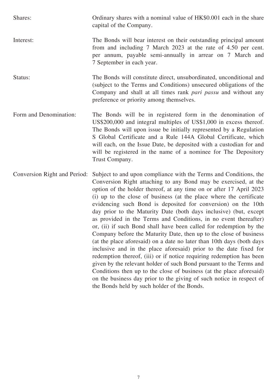 7 Shares: Ordinary shares with a nominal value of HK$0.001 each in the share capital of the Company. Interest: The Bonds will bear interest on their outstanding principal amount from and including 7 March 2023 at the rate of 4.50 per cent. per annum, payable semi-annually in arrear on 7 March and 7 September in each year. Status: The Bonds will constitute direct, unsubordinated, unconditional and (subject to the Terms and Conditions) unsecured obligations of the Company and shall at all times rank pari passu and without any preference or priority among themselves. Form and Denomination: The Bonds will be in registered form in the denomination of US$200,000 and integral multiples of US$1,000 in excess thereof. The Bonds will upon issue be initially represented by a Regulation S Global Certificate and a Rule 144A Global Certificate, which will each, on the Issue Date, be deposited with a custodian for and will be registered in the name of a nominee for The Depository Trust Company. Conversion Right and Period: Subject to and upon compliance with the Terms and Conditions, the Conversion Right attaching to any Bond may be exercised, at the option of the holder thereof, at any time on or after 17 April 2023 (i) up to the close of business (at the place where the certificate evidencing such Bond is deposited for conversion) on the 10th day prior to the Maturity Date (both days inclusive) (but, except as provided in the Terms and Conditions, in no event thereafter) or, (ii) if such Bond shall have been called for redemption by the Company before the Maturity Date, then up to the close of business (at the place aforesaid) on a date no later than 10th days (both days inclusive and in the place aforesaid) prior to the date fixed for redemption thereof, (iii) or if notice requiring redemption has been given by the relevant holder of such Bond pursuant to the Terms and Conditions then up to the close of business (at the place aforesaid) on the business day prior to the giving of such notice in respect of the Bonds held by such holder of the Bonds.