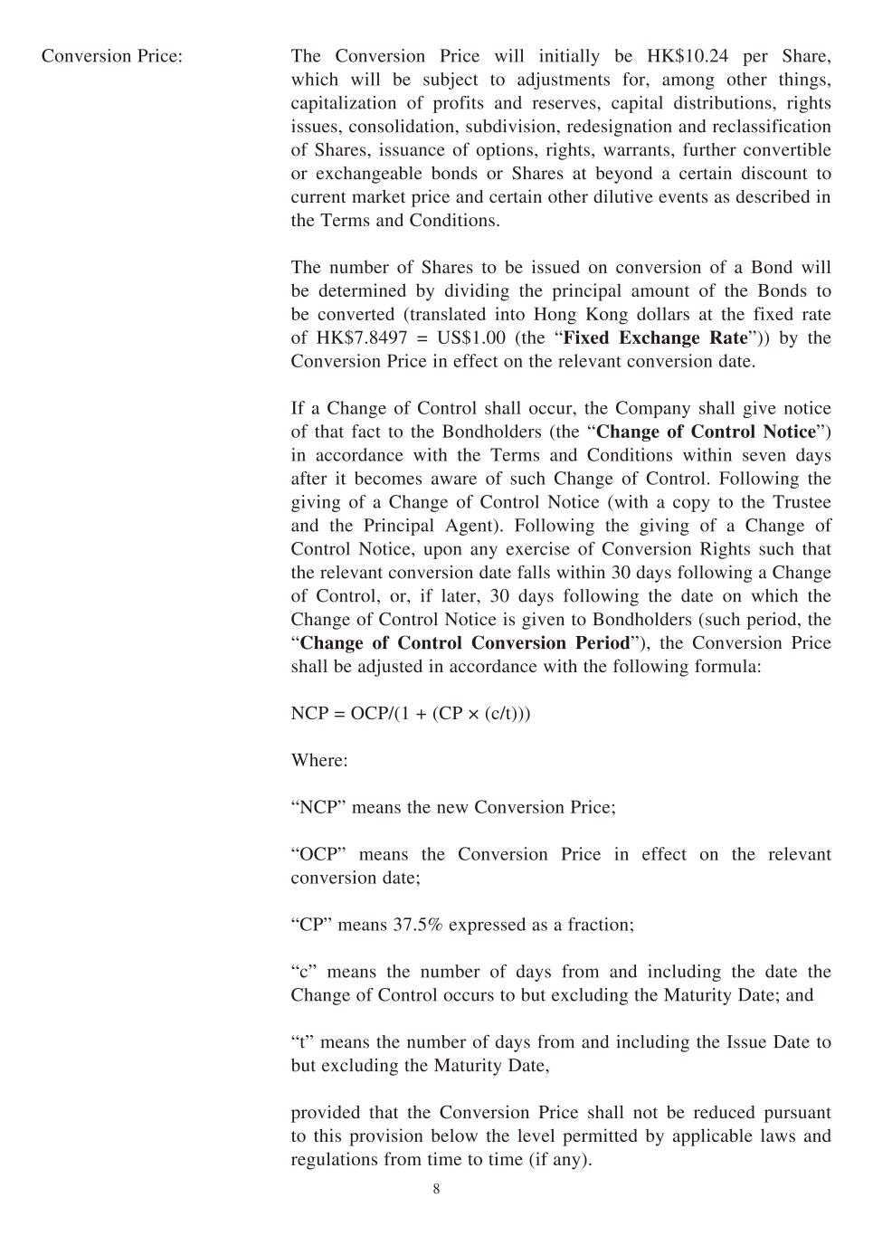 8 Conversion Price: The Conversion Price will initially be HK$10.24 per Share, which will be subject to adjustments for, among other things, capitalization of profits and reserves, capital distributions, rights issues, consolidation, subdivision, redesignation and reclassification of Shares, issuance of options, rights, warrants, further convertible or exchangeable bonds or Shares at beyond a certain discount to current market price and certain other dilutive events as described in the Terms and Conditions. The number of Shares to be issued on conversion of a Bond will be determined by dividing the principal amount of the Bonds to be converted (translated into Hong Kong dollars at the fixed rate of HK$7.8497 = US$1.00 (the “Fixed Exchange Rate”)) by the Conversion Price in effect on the relevant conversion date. If a Change of Control shall occur, the Company shall give notice of that fact to the Bondholders (the “Change of Control Notice”) in accordance with the Terms and Conditions within seven days after it becomes aware of such Change of Control. Following the giving of a Change of Control Notice (with a copy to the Trustee and the Principal Agent). Following the giving of a Change of Control Notice, upon any exercise of Conversion Rights such that the relevant conversion date falls within 30 days following a Change of Control, or, if later, 30 days following the date on which the Change of Control Notice is given to Bondholders (such period, the “Change of Control Conversion Period”), the Conversion Price shall be adjusted in accordance with the following formula: NCP = OCP/(1 + (CP × (c/t))) Where: “NCP” means the new Conversion Price; “OCP” means the Conversion Price in effect on the relevant conversion date; “CP” means 37.5% expressed as a fraction; “c” means the number of days from and including the date the Change of Control occurs to but excluding the Maturity Date; and “t” means the number of days from and including the Issue Date to but excluding the Maturity Date, provided that the Conversion Price shall not be reduced pursuant to this provision below the level permitted by applicable laws and regulations from time to time (if any).