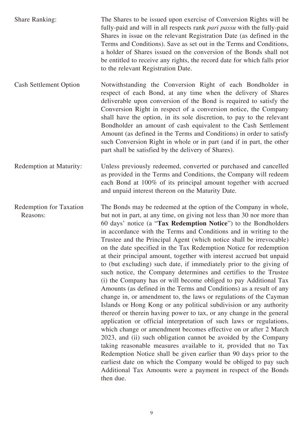 9 Share Ranking: The Shares to be issued upon exercise of Conversion Rights will be fully-paid and will in all respects rank pari passu with the fully-paid Shares in issue on the relevant Registration Date (as defined in the Terms and Conditions). Save as set out in the Terms and Conditions, a holder of Shares issued on the conversion of the Bonds shall not be entitled to receive any rights, the record date for which falls prior to the relevant Registration Date. Cash Settlement Option Notwithstanding the Conversion Right of each Bondholder in respect of each Bond, at any time when the delivery of Shares deliverable upon conversion of the Bond is required to satisfy the Conversion Right in respect of a conversion notice, the Company shall have the option, in its sole discretion, to pay to the relevant Bondholder an amount of cash equivalent to the Cash Settlement Amount (as defined in the Terms and Conditions) in order to satisfy such Conversion Right in whole or in part (and if in part, the other part shall be satisfied by the delivery of Shares). Redemption at Maturity: Unless previously redeemed, converted or purchased and cancelled as provided in the Terms and Conditions, the Company will redeem each Bond at 100% of its principal amount together with accrued and unpaid interest thereon on the Maturity Date. Redemption for Taxation Reasons: The Bonds may be redeemed at the option of the Company in whole, but not in part, at any time, on giving not less than 30 nor more than 60 days’ notice (a “Tax Redemption Notice”) to the Bondholders in accordance with the Terms and Conditions and in writing to the Trustee and the Principal Agent (which notice shall be irrevocable) on the date specified in the Tax Redemption Notice for redemption at their principal amount, together with interest accrued but unpaid to (but excluding) such date, if immediately prior to the giving of such notice, the Company determines and certifies to the Trustee (i) the Company has or will become obliged to pay Additional Tax Amounts (as defined in the Terms and Conditions) as a result of any change in, or amendment to, the laws or regulations of the Cayman Islands or Hong Kong or any political subdivision or any authority thereof or therein having power to tax, or any change in the general application or official interpretation of such laws or regulations, which change or amendment becomes effective on or after 2 March 2023, and (ii) such obligation cannot be avoided by the Company taking reasonable measures available to it, provided that no Tax Redemption Notice shall be given earlier than 90 days prior to the earliest date on which the Company would be obliged to pay such Additional Tax Amounts were a payment in respect of the Bonds then due.
