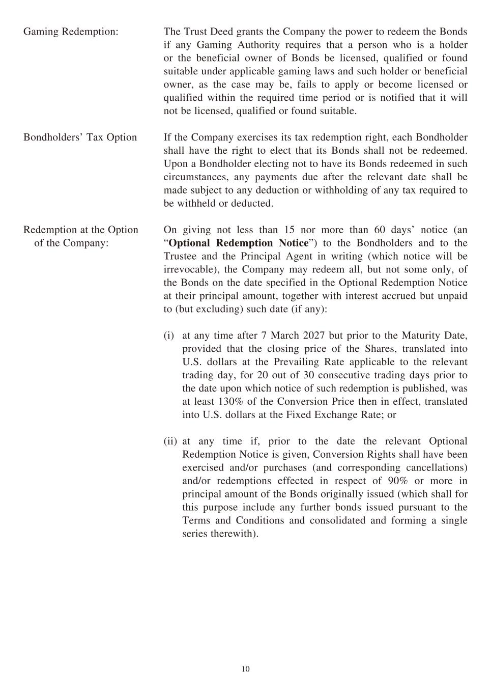 10 Gaming Redemption: The Trust Deed grants the Company the power to redeem the Bonds if any Gaming Authority requires that a person who is a holder or the beneficial owner of Bonds be licensed, qualified or found suitable under applicable gaming laws and such holder or beneficial owner, as the case may be, fails to apply or become licensed or qualified within the required time period or is notified that it will not be licensed, qualified or found suitable. Bondholders’ Tax Option If the Company exercises its tax redemption right, each Bondholder shall have the right to elect that its Bonds shall not be redeemed. Upon a Bondholder electing not to have its Bonds redeemed in such circumstances, any payments due after the relevant date shall be made subject to any deduction or withholding of any tax required to be withheld or deducted. Redemption at the Option of the Company: On giving not less than 15 nor more than 60 days’ notice (an “Optional Redemption Notice”) to the Bondholders and to the Trustee and the Principal Agent in writing (which notice will be irrevocable), the Company may redeem all, but not some only, of the Bonds on the date specified in the Optional Redemption Notice at their principal amount, together with interest accrued but unpaid to (but excluding) such date (if any): (i) at any time after 7 March 2027 but prior to the Maturity Date, provided that the closing price of the Shares, translated into U.S. dollars at the Prevailing Rate applicable to the relevant trading day, for 20 out of 30 consecutive trading days prior to the date upon which notice of such redemption is published, was at least 130% of the Conversion Price then in effect, translated into U.S. dollars at the Fixed Exchange Rate; or (ii) at any time if, prior to the date the relevant Optional Redemption Notice is given, Conversion Rights shall have been exercised and/or purchases (and corresponding cancellations) and/or redemptions effected in respect of 90% or more in principal amount of the Bonds originally issued (which shall for this purpose include any further bonds issued pursuant to the Terms and Conditions and consolidated and forming a single series therewith).