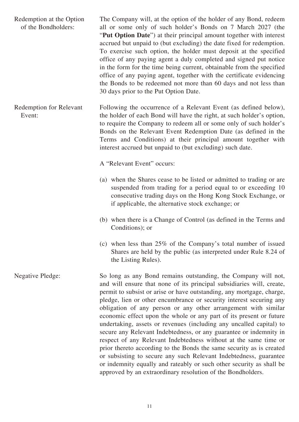 11 Redemption at the Option of the Bondholders: The Company will, at the option of the holder of any Bond, redeem all or some only of such holder’s Bonds on 7 March 2027 (the “Put Option Date”) at their principal amount together with interest accrued but unpaid to (but excluding) the date fixed for redemption. To exercise such option, the holder must deposit at the specified office of any paying agent a duly completed and signed put notice in the form for the time being current, obtainable from the specified office of any paying agent, together with the certificate evidencing the Bonds to be redeemed not more than 60 days and not less than 30 days prior to the Put Option Date. Redemption for Relevant Event: Following the occurrence of a Relevant Event (as defined below), the holder of each Bond will have the right, at such holder’s option, to require the Company to redeem all or some only of such holder’s Bonds on the Relevant Event Redemption Date (as defined in the Terms and Conditions) at their principal amount together with interest accrued but unpaid to (but excluding) such date. A “Relevant Event” occurs: (a) when the Shares cease to be listed or admitted to trading or are suspended from trading for a period equal to or exceeding 10 consecutive trading days on the Hong Kong Stock Exchange, or if applicable, the alternative stock exchange; or (b) when there is a Change of Control (as defined in the Terms and Conditions); or (c) when less than 25% of the Company’s total number of issued Shares are held by the public (as interpreted under Rule 8.24 of the Listing Rules). Negative Pledge: So long as any Bond remains outstanding, the Company will not, and will ensure that none of its principal subsidiaries will, create, permit to subsist or arise or have outstanding, any mortgage, charge, pledge, lien or other encumbrance or security interest securing any obligation of any person or any other arrangement with similar economic effect upon the whole or any part of its present or future undertaking, assets or revenues (including any uncalled capital) to secure any Relevant Indebtedness, or any guarantee or indemnity in respect of any Relevant Indebtedness without at the same time or prior thereto according to the Bonds the same security as is created or subsisting to secure any such Relevant Indebtedness, guarantee or indemnity equally and rateably or such other security as shall be approved by an extraordinary resolution of the Bondholders.