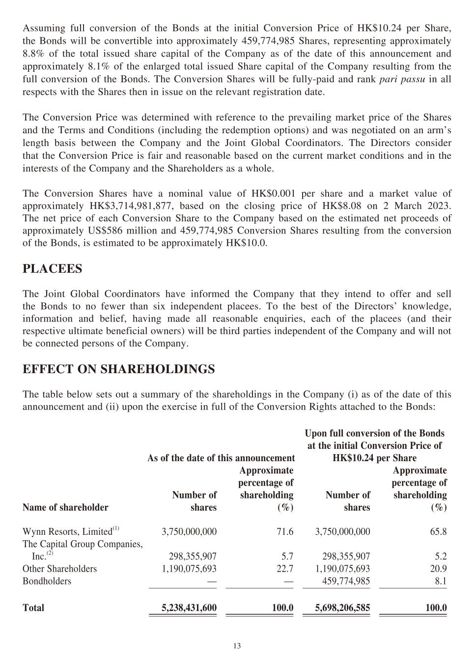 13 Assuming full conversion of the Bonds at the initial Conversion Price of HK$10.24 per Share, the Bonds will be convertible into approximately 459,774,985 Shares, representing approximately 8.8% of the total issued share capital of the Company as of the date of this announcement and approximately 8.1% of the enlarged total issued Share capital of the Company resulting from the full conversion of the Bonds. The Conversion Shares will be fully-paid and rank pari passu in all respects with the Shares then in issue on the relevant registration date. The Conversion Price was determined with reference to the prevailing market price of the Shares and the Terms and Conditions (including the redemption options) and was negotiated on an arm’s length basis between the Company and the Joint Global Coordinators. The Directors consider that the Conversion Price is fair and reasonable based on the current market conditions and in the interests of the Company and the Shareholders as a whole. The Conversion Shares have a nominal value of HK$0.001 per share and a market value of approximately HK$3,714,981,877, based on the closing price of HK$8.08 on 2 March 2023. The net price of each Conversion Share to the Company based on the estimated net proceeds of approximately US$586 million and 459,774,985 Conversion Shares resulting from the conversion of the Bonds, is estimated to be approximately HK$10.0. PLACEES The Joint Global Coordinators have informed the Company that they intend to offer and sell the Bonds to no fewer than six independent placees. To the best of the Directors’ knowledge, information and belief, having made all reasonable enquiries, each of the placees (and their respective ultimate beneficial owners) will be third parties independent of the Company and will not be connected persons of the Company. EFFECT ON SHAREHOLDINGS The table below sets out a summary of the shareholdings in the Company (i) as of the date of this announcement and (ii) upon the exercise in full of the Conversion Rights attached to the Bonds: As of the date of this announcement Upon full conversion of the Bonds at the initial Conversion Price of HK$10.24 per Share Name of shareholder Number of shares Approximate percentage of shareholding (%) Number of shares Approximate percentage of shareholding (%) Wynn Resorts, Limited(1) 3,750,000,000 71.6 3,750,000,000 65.8 The Capital Group Companies, Inc.(2) 298,355,907 5.7 298,355,907 5.2 Other Shareholders 1,190,075,693 22.7 1,190,075,693 20.9 Bondholders — — 459,774,985 8.1 Total 5,238,431,600 100.0 5,698,206,585 100.0