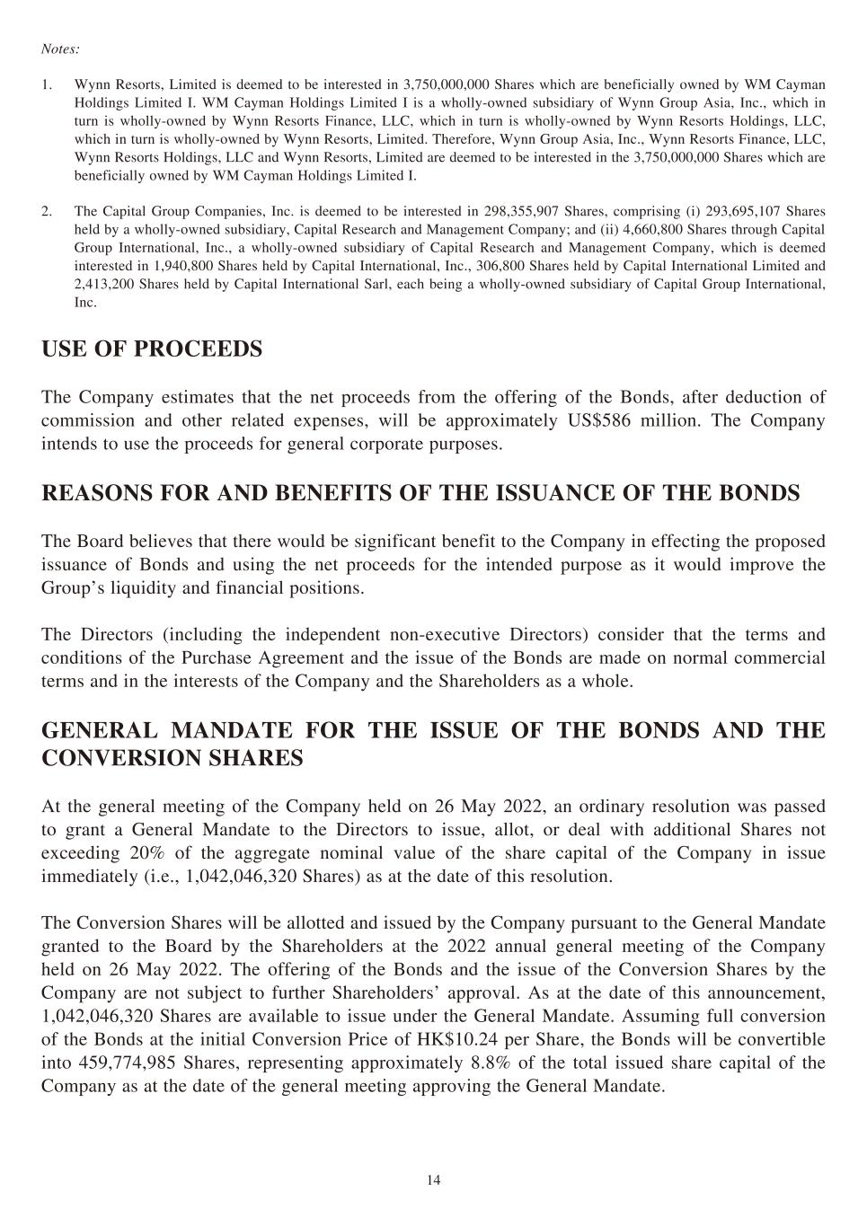 14 Notes: 1. Wynn Resorts, Limited is deemed to be interested in 3,750,000,000 Shares which are beneficially owned by WM Cayman Holdings Limited I. WM Cayman Holdings Limited I is a wholly-owned subsidiary of Wynn Group Asia, Inc., which in turn is wholly-owned by Wynn Resorts Finance, LLC, which in turn is wholly-owned by Wynn Resorts Holdings, LLC, which in turn is wholly-owned by Wynn Resorts, Limited. Therefore, Wynn Group Asia, Inc., Wynn Resorts Finance, LLC, Wynn Resorts Holdings, LLC and Wynn Resorts, Limited are deemed to be interested in the 3,750,000,000 Shares which are beneficially owned by WM Cayman Holdings Limited I. 2. The Capital Group Companies, Inc. is deemed to be interested in 298,355,907 Shares, comprising (i) 293,695,107 Shares held by a wholly-owned subsidiary, Capital Research and Management Company; and (ii) 4,660,800 Shares through Capital Group International, Inc., a wholly-owned subsidiary of Capital Research and Management Company, which is deemed interested in 1,940,800 Shares held by Capital International, Inc., 306,800 Shares held by Capital International Limited and 2,413,200 Shares held by Capital International Sarl, each being a wholly-owned subsidiary of Capital Group International, Inc. USE OF PROCEEDS The Company estimates that the net proceeds from the offering of the Bonds, after deduction of commission and other related expenses, will be approximately US$586 million. The Company intends to use the proceeds for general corporate purposes. REASONS FOR AND BENEFITS OF THE ISSUANCE OF THE BONDS The Board believes that there would be significant benefit to the Company in effecting the proposed issuance of Bonds and using the net proceeds for the intended purpose as it would improve the Group’s liquidity and financial positions. The Directors (including the independent non-executive Directors) consider that the terms and conditions of the Purchase Agreement and the issue of the Bonds are made on normal commercial terms and in the interests of the Company and the Shareholders as a whole. GENERAL MANDATE FOR THE ISSUE OF THE BONDS AND THE CONVERSION SHARES At the general meeting of the Company held on 26 May 2022, an ordinary resolution was passed to grant a General Mandate to the Directors to issue, allot, or deal with additional Shares not exceeding 20% of the aggregate nominal value of the share capital of the Company in issue immediately (i.e., 1,042,046,320 Shares) as at the date of this resolution. The Conversion Shares will be allotted and issued by the Company pursuant to the General Mandate granted to the Board by the Shareholders at the 2022 annual general meeting of the Company held on 26 May 2022. The offering of the Bonds and the issue of the Conversion Shares by the Company are not subject to further Shareholders’ approval. As at the date of this announcement, 1,042,046,320 Shares are available to issue under the General Mandate. Assuming full conversion of the Bonds at the initial Conversion Price of HK$10.24 per Share, the Bonds will be convertible into 459,774,985 Shares, representing approximately 8.8% of the total issued share capital of the Company as at the date of the general meeting approving the General Mandate.