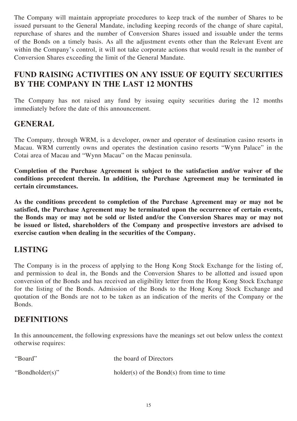 15 The Company will maintain appropriate procedures to keep track of the number of Shares to be issued pursuant to the General Mandate, including keeping records of the change of share capital, repurchase of shares and the number of Conversion Shares issued and issuable under the terms of the Bonds on a timely basis. As all the adjustment events other than the Relevant Event are within the Company’s control, it will not take corporate actions that would result in the number of Conversion Shares exceeding the limit of the General Mandate. FUND RAISING ACTIVITIES ON ANY ISSUE OF EQUITY SECURITIES BY THE COMPANY IN THE LAST 12 MONTHS The Company has not raised any fund by issuing equity securities during the 12 months immediately before the date of this announcement. GENERAL The Company, through WRM, is a developer, owner and operator of destination casino resorts in Macau. WRM currently owns and operates the destination casino resorts “Wynn Palace” in the Cotai area of Macau and “Wynn Macau” on the Macau peninsula. Completion of the Purchase Agreement is subject to the satisfaction and/or waiver of the conditions precedent therein. In addition, the Purchase Agreement may be terminated in certain circumstances. As the conditions precedent to completion of the Purchase Agreement may or may not be satisfied, the Purchase Agreement may be terminated upon the occurrence of certain events, the Bonds may or may not be sold or listed and/or the Conversion Shares may or may not be issued or listed, shareholders of the Company and prospective investors are advised to exercise caution when dealing in the securities of the Company. LISTING The Company is in the process of applying to the Hong Kong Stock Exchange for the listing of, and permission to deal in, the Bonds and the Conversion Shares to be allotted and issued upon conversion of the Bonds and has received an eligibility letter from the Hong Kong Stock Exchange for the listing of the Bonds. Admission of the Bonds to the Hong Kong Stock Exchange and quotation of the Bonds are not to be taken as an indication of the merits of the Company or the Bonds. DEFINITIONS In this announcement, the following expressions have the meanings set out below unless the context otherwise requires: “Board” the board of Directors “Bondholder(s)” holder(s) of the Bond(s) from time to time