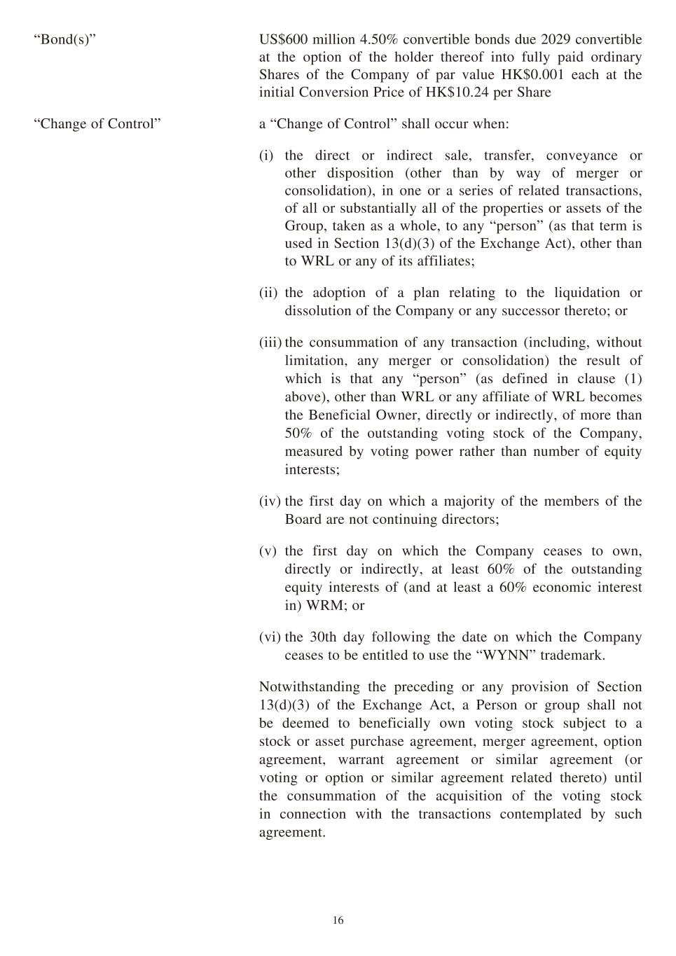 16 “Bond(s)” US$600 million 4.50% convertible bonds due 2029 convertible at the option of the holder thereof into fully paid ordinary Shares of the Company of par value HK$0.001 each at the initial Conversion Price of HK$10.24 per Share “Change of Control” a “Change of Control” shall occur when: (i) the direct or indirect sale, transfer, conveyance or other disposition (other than by way of merger or consolidation), in one or a series of related transactions, of all or substantially all of the properties or assets of the Group, taken as a whole, to any “person” (as that term is used in Section 13(d)(3) of the Exchange Act), other than to WRL or any of its affiliates; (ii) the adoption of a plan relating to the liquidation or dissolution of the Company or any successor thereto; or (iii) the consummation of any transaction (including, without limitation, any merger or consolidation) the result of which is that any “person” (as defined in clause (1) above), other than WRL or any affiliate of WRL becomes the Beneficial Owner, directly or indirectly, of more than 50% of the outstanding voting stock of the Company, measured by voting power rather than number of equity interests; (iv) the first day on which a majority of the members of the Board are not continuing directors; (v) the first day on which the Company ceases to own, directly or indirectly, at least 60% of the outstanding equity interests of (and at least a 60% economic interest in) WRM; or (vi) the 30th day following the date on which the Company ceases to be entitled to use the “WYNN” trademark. Notwithstanding the preceding or any provision of Section 13(d)(3) of the Exchange Act, a Person or group shall not be deemed to beneficially own voting stock subject to a stock or asset purchase agreement, merger agreement, option agreement, warrant agreement or similar agreement (or voting or option or similar agreement related thereto) until the consummation of the acquisition of the voting stock in connection with the transactions contemplated by such agreement.