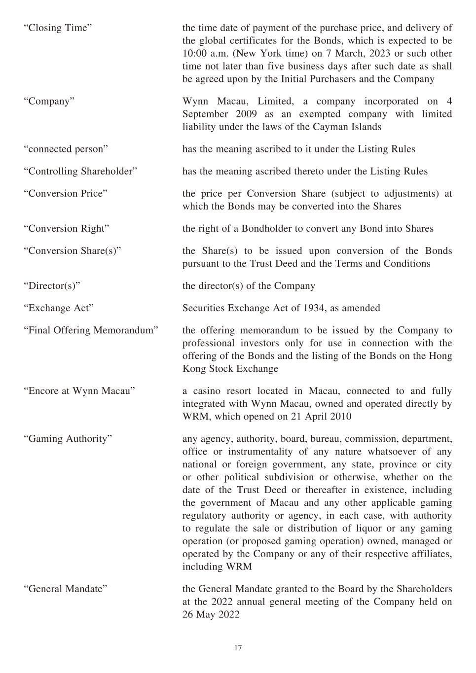 17 “Closing Time” the time date of payment of the purchase price, and delivery of the global certificates for the Bonds, which is expected to be 10:00 a.m. (New York time) on 7 March, 2023 or such other time not later than five business days after such date as shall be agreed upon by the Initial Purchasers and the Company “Company” Wynn Macau, Limited, a company incorporated on 4 September 2009 as an exempted company with limited liability under the laws of the Cayman Islands “connected person” has the meaning ascribed to it under the Listing Rules “Controlling Shareholder” has the meaning ascribed thereto under the Listing Rules “Conversion Price” the price per Conversion Share (subject to adjustments) at which the Bonds may be converted into the Shares “Conversion Right” the right of a Bondholder to convert any Bond into Shares “Conversion Share(s)” the Share(s) to be issued upon conversion of the Bonds pursuant to the Trust Deed and the Terms and Conditions “Director(s)” the director(s) of the Company “Exchange Act” Securities Exchange Act of 1934, as amended “Final Offering Memorandum” the offering memorandum to be issued by the Company to professional investors only for use in connection with the offering of the Bonds and the listing of the Bonds on the Hong Kong Stock Exchange “Encore at Wynn Macau” a casino resort located in Macau, connected to and fully integrated with Wynn Macau, owned and operated directly by WRM, which opened on 21 April 2010 “Gaming Authority” any agency, authority, board, bureau, commission, department, office or instrumentality of any nature whatsoever of any national or foreign government, any state, province or city or other political subdivision or otherwise, whether on the date of the Trust Deed or thereafter in existence, including the government of Macau and any other applicable gaming regulatory authority or agency, in each case, with authority to regulate the sale or distribution of liquor or any gaming operation (or proposed gaming operation) owned, managed or operated by the Company or any of their respective affiliates, including WRM “General Mandate” the General Mandate granted to the Board by the Shareholders at the 2022 annual general meeting of the Company held on 26 May 2022