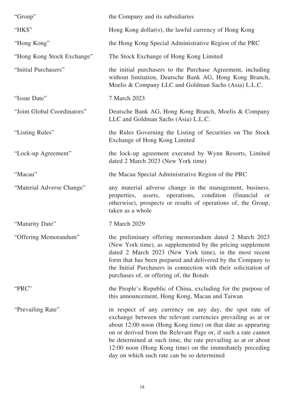 18 “Group” the Company and its subsidiaries “HK$” Hong Kong dollar(s), the lawful currency of Hong Kong “Hong Kong” the Hong Kong Special Administrative Region of the PRC “Hong Kong Stock Exchange” The Stock Exchange of Hong Kong Limited “Initial Purchasers” the initial purchasers to the Purchase Agreement, including without limitation, Deutsche Bank AG, Hong Kong Branch, Moelis & Company LLC and Goldman Sachs (Asia) L.L.C. “Issue Date” 7 March 2023 “Joint Global Coordinators” Deutsche Bank AG, Hong Kong Branch, Moelis & Company LLC and Goldman Sachs (Asia) L.L.C. “Listing Rules” the Rules Governing the Listing of Securities on The Stock Exchange of Hong Kong Limited “Lock-up Agreement” the lock-up agreement executed by Wynn Resorts, Limited dated 2 March 2023 (New York time) “Macau” the Macau Special Administrative Region of the PRC “Material Adverse Change” any material adverse change in the management, business, properties, assets, operations, condition (financial or otherwise), prospects or results of operations of, the Group, taken as a whole “Maturity Date” 7 March 2029 “Offering Memorandum” the preliminary offering memorandum dated 2 March 2023 (New York time), as supplemented by the pricing supplement dated 2 March 2023 (New York time), in the most recent form that has been prepared and delivered by the Company to the Initial Purchasers in connection with their solicitation of purchases of, or offering of, the Bonds “PRC” the People’s Republic of China, excluding for the purpose of this announcement, Hong Kong, Macau and Taiwan “Prevailing Rate” in respect of any currency on any day, the spot rate of exchange between the relevant currencies prevailing as at or about 12:00 noon (Hong Kong time) on that date as appearing on or derived from the Relevant Page or, if such a rate cannot be determined at such time, the rate prevailing as at or about 12:00 noon (Hong Kong time) on the immediately preceding day on which such rate can be so determined