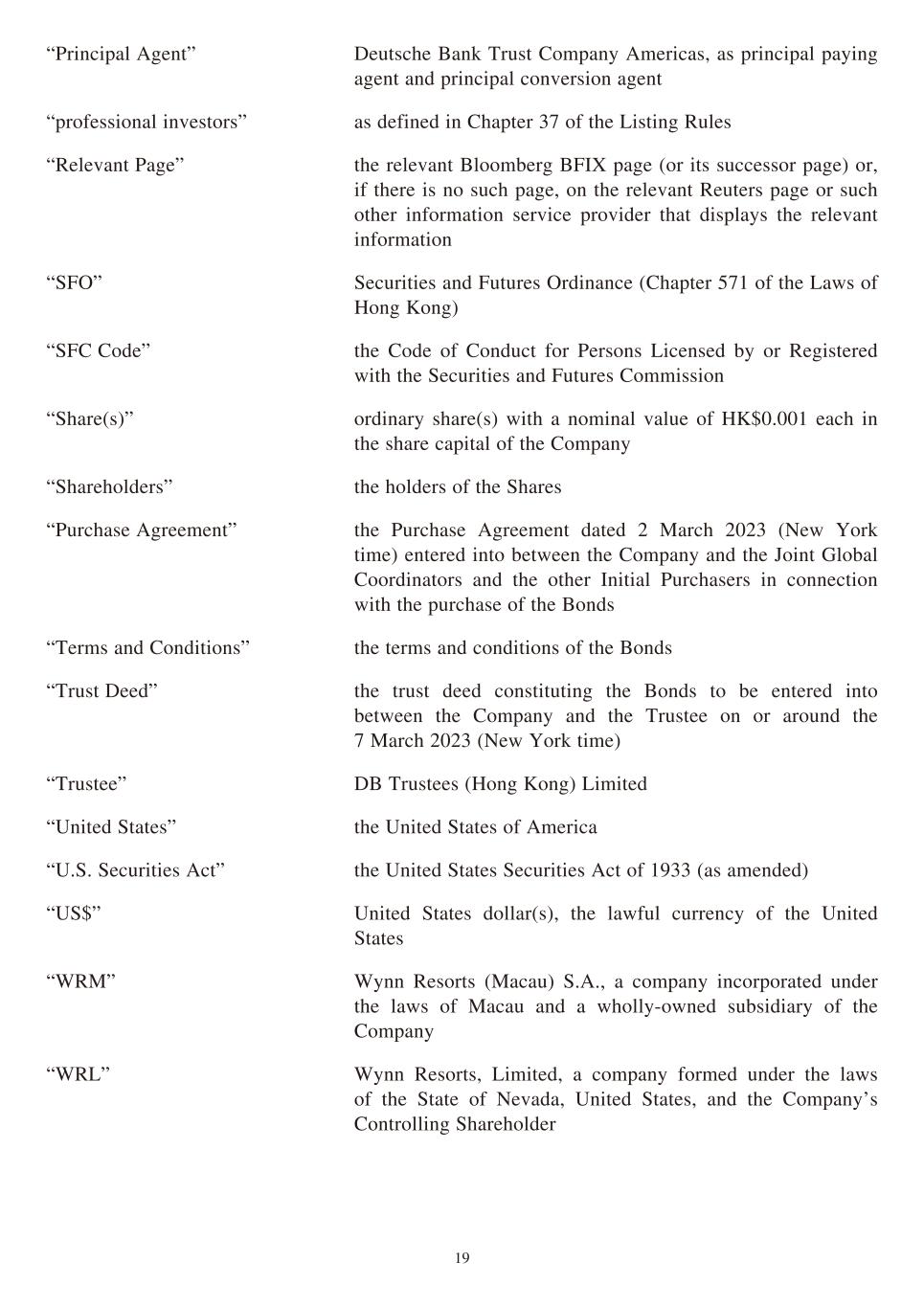 19 “Principal Agent” Deutsche Bank Trust Company Americas, as principal paying agent and principal conversion agent “professional investors” as defined in Chapter 37 of the Listing Rules “Relevant Page” the relevant Bloomberg BFIX page (or its successor page) or, if there is no such page, on the relevant Reuters page or such other information service provider that displays the relevant information “SFO” Securities and Futures Ordinance (Chapter 571 of the Laws of Hong Kong) “SFC Code” the Code of Conduct for Persons Licensed by or Registered with the Securities and Futures Commission “Share(s)” ordinary share(s) with a nominal value of HK$0.001 each in the share capital of the Company “Shareholders” the holders of the Shares “Purchase Agreement” the Purchase Agreement dated 2 March 2023 (New York time) entered into between the Company and the Joint Global Coordinators and the other Initial Purchasers in connection with the purchase of the Bonds “Terms and Conditions” the terms and conditions of the Bonds “Trust Deed” the trust deed constituting the Bonds to be entered into between the Company and the Trustee on or around the 7 March 2023 (New York time) “Trustee” DB Trustees (Hong Kong) Limited “United States” the United States of America “U.S. Securities Act” the United States Securities Act of 1933 (as amended) “US$” United States dollar(s), the lawful currency of the United States “WRM” Wynn Resorts (Macau) S.A., a company incorporated under the laws of Macau and a wholly-owned subsidiary of the Company “WRL” Wynn Resorts, Limited, a company formed under the laws of the State of Nevada, United States, and the Company’s Controlling Shareholder