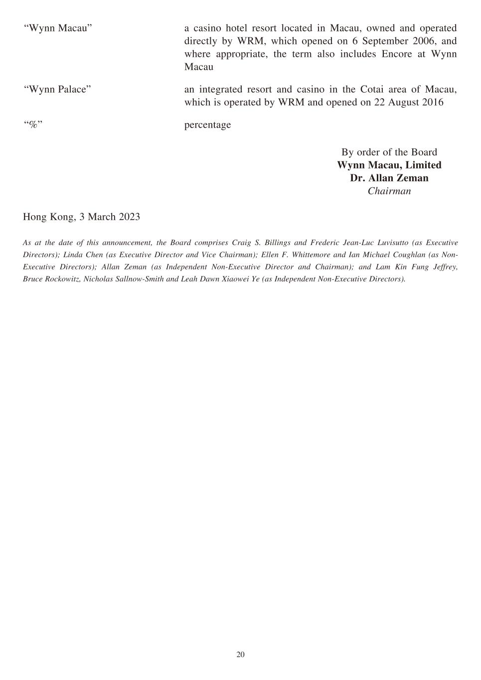 20 “Wynn Macau” a casino hotel resort located in Macau, owned and operated directly by WRM, which opened on 6 September 2006, and where appropriate, the term also includes Encore at Wynn Macau “Wynn Palace” an integrated resort and casino in the Cotai area of Macau, which is operated by WRM and opened on 22 August 2016 “%” percentage By order of the Board Wynn Macau, Limited Dr. Allan Zeman Chairman Hong Kong, 3 March 2023 As at the date of this announcement, the Board comprises Craig S. Billings and Frederic Jean-Luc Luvisutto (as Executive Directors); Linda Chen (as Executive Director and Vice Chairman); Ellen F. Whittemore and Ian Michael Coughlan (as Non- Executive Directors); Allan Zeman (as Independent Non-Executive Director and Chairman); and Lam Kin Fung Jeffrey, Bruce Rockowitz, Nicholas Sallnow-Smith and Leah Dawn Xiaowei Ye (as Independent Non-Executive Directors).