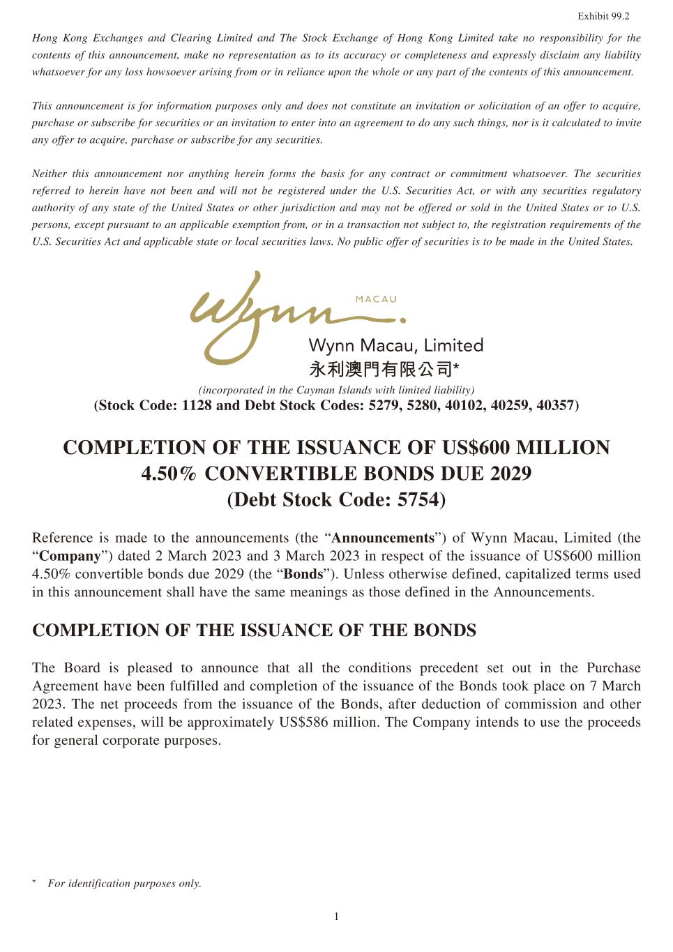 1 Hong Kong Exchanges and Clearing Limited and The Stock Exchange of Hong Kong Limited take no responsibility for the contents of this announcement, make no representation as to its accuracy or completeness and expressly disclaim any liability whatsoever for any loss howsoever arising from or in reliance upon the whole or any part of the contents of this announcement. This announcement is for information purposes only and does not constitute an invitation or solicitation of an offer to acquire, purchase or subscribe for securities or an invitation to enter into an agreement to do any such things, nor is it calculated to invite any offer to acquire, purchase or subscribe for any securities. Neither this announcement nor anything herein forms the basis for any contract or commitment whatsoever. The securities referred to herein have not been and will not be registered under the U.S. Securities Act, or with any securities regulatory authority of any state of the United States or other jurisdiction and may not be offered or sold in the United States or to U.S. persons, except pursuant to an applicable exemption from, or in a transaction not subject to, the registration requirements of the U.S. Securities Act and applicable state or local securities laws. No public offer of securities is to be made in the United States. (incorporated in the Cayman Islands with limited liability) (Stock Code: 1128 and Debt Stock Codes: 5279, 5280, 40102, 40259, 40357) COMPLETION OF THE ISSUANCE OF US$600 MILLION 4.50% CONVERTIBLE BONDS DUE 2029 (Debt Stock Code: 5754) Reference is made to the announcements (the “Announcements”) of Wynn Macau, Limited (the “Company”) dated 2 March 2023 and 3 March 2023 in respect of the issuance of US$600 million 4.50% convertible bonds due 2029 (the “Bonds”). Unless otherwise defined, capitalized terms used in this announcement shall have the same meanings as those defined in the Announcements. COMPLETION OF THE ISSUANCE OF THE BONDS The Board is pleased to announce that all the conditions precedent set out in the Purchase Agreement have been fulfilled and completion of the issuance of the Bonds took place on 7 March 2023. The net proceeds from the issuance of the Bonds, after deduction of commission and other related expenses, will be approximately US$586 million. The Company intends to use the proceeds for general corporate purposes. * For identification purposes only. Exhibit 99.2
