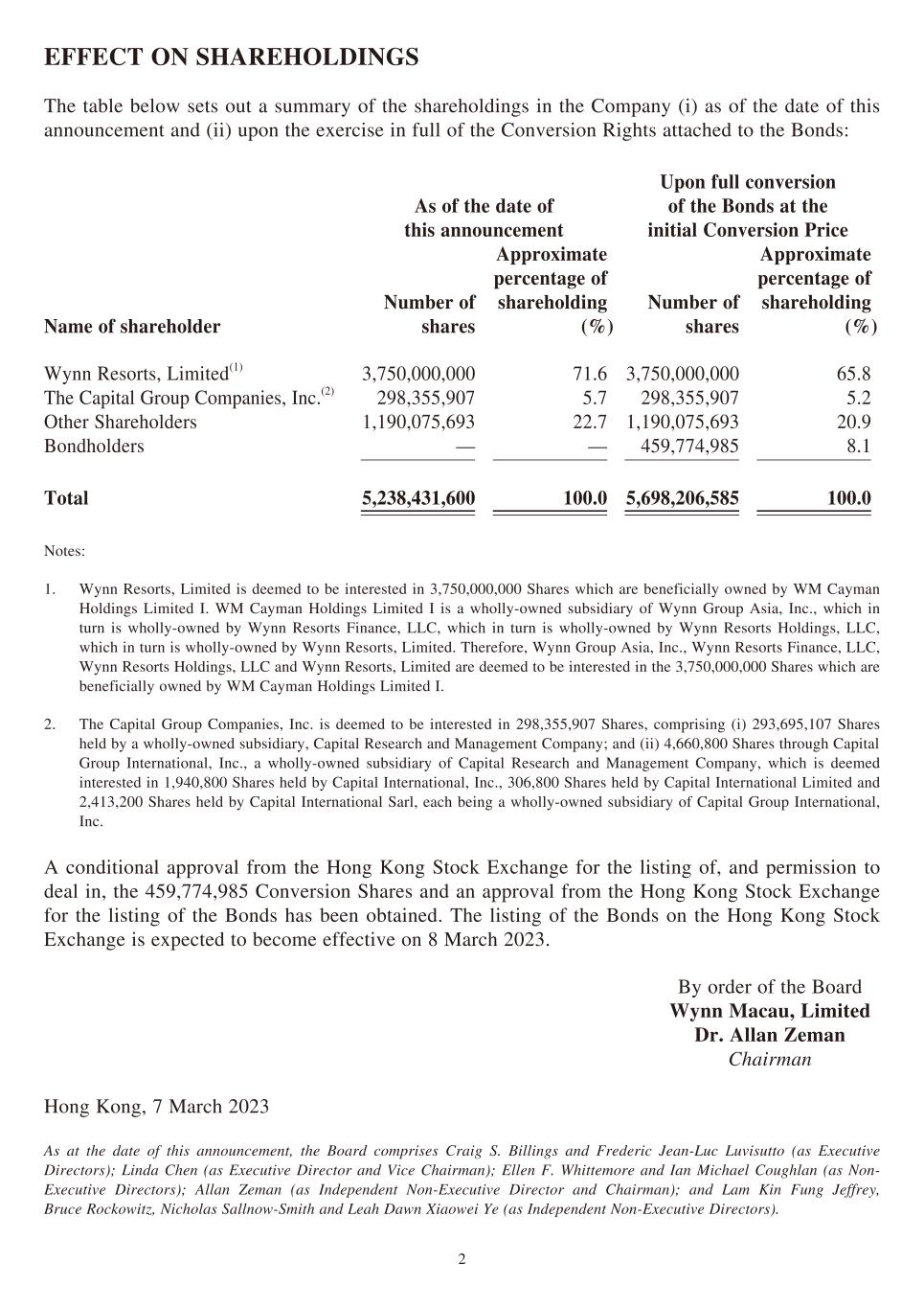 2 EFFECT ON SHAREHOLDINGS The table below sets out a summary of the shareholdings in the Company (i) as of the date of this announcement and (ii) upon the exercise in full of the Conversion Rights attached to the Bonds: As of the date of this announcement Upon full conversion of the Bonds at the initial Conversion Price Name of shareholder Number of shares Approximate percentage of shareholding (%) Number of shares Approximate percentage of shareholding (%) Wynn Resorts, Limited(1) 3,750,000,000 71.6 3,750,000,000 65.8 The Capital Group Companies, Inc.(2) 298,355,907 5.7 298,355,907 5.2 Other Shareholders 1,190,075,693 22.7 1,190,075,693 20.9 Bondholders — — 459,774,985 8.1 Total 5,238,431,600 100.0 5,698,206,585 100.0 Notes: 1. Wynn Resorts, Limited is deemed to be interested in 3,750,000,000 Shares which are beneficially owned by WM Cayman Holdings Limited I. WM Cayman Holdings Limited I is a wholly-owned subsidiary of Wynn Group Asia, Inc., which in turn is wholly-owned by Wynn Resorts Finance, LLC, which in turn is wholly-owned by Wynn Resorts Holdings, LLC, which in turn is wholly-owned by Wynn Resorts, Limited. Therefore, Wynn Group Asia, Inc., Wynn Resorts Finance, LLC, Wynn Resorts Holdings, LLC and Wynn Resorts, Limited are deemed to be interested in the 3,750,000,000 Shares which are beneficially owned by WM Cayman Holdings Limited I. 2. The Capital Group Companies, Inc. is deemed to be interested in 298,355,907 Shares, comprising (i) 293,695,107 Shares held by a wholly-owned subsidiary, Capital Research and Management Company; and (ii) 4,660,800 Shares through Capital Group International, Inc., a wholly-owned subsidiary of Capital Research and Management Company, which is deemed interested in 1,940,800 Shares held by Capital International, Inc., 306,800 Shares held by Capital International Limited and 2,413,200 Shares held by Capital International Sarl, each being a wholly-owned subsidiary of Capital Group International, Inc. A conditional approval from the Hong Kong Stock Exchange for the listing of, and permission to deal in, the 459,774,985 Conversion Shares and an approval from the Hong Kong Stock Exchange for the listing of the Bonds has been obtained. The listing of the Bonds on the Hong Kong Stock Exchange is expected to become effective on 8 March 2023. By order of the Board Wynn Macau, Limited Dr. Allan Zeman Chairman Hong Kong, 7 March 2023 As at the date of this announcement, the Board comprises Craig S. Billings and Frederic Jean-Luc Luvisutto (as Executive Directors); Linda Chen (as Executive Director and Vice Chairman); Ellen F. Whittemore and Ian Michael Coughlan (as Non- Executive Directors); Allan Zeman (as Independent Non-Executive Director and Chairman); and Lam Kin Fung Jeffrey, Bruce Rockowitz, Nicholas Sallnow-Smith and Leah Dawn Xiaowei Ye (as Independent Non-Executive Directors).