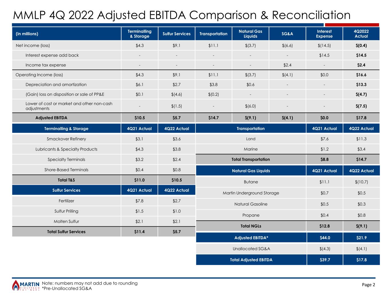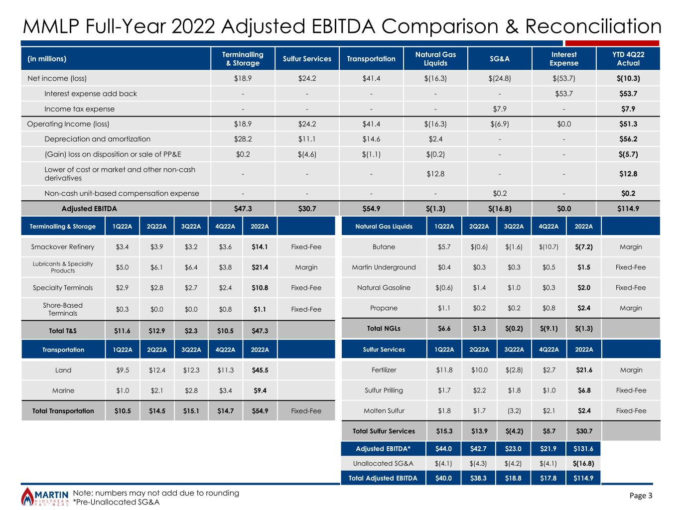 Page 2 MMLP 4Q 2022 Adjusted EBITDA Comparison & Reconciliation Note: numbers may not add due to rounding *Pre-Unallocated SG&A (in millions) Terminalling & Storage Sulfur Services Transportation Natural Gas Liquids SG&A Interest Expense 4Q2022 Actual Net income (loss) $4.3 $9.1 $11.1 $(3.7) $(6.6) $(14.5) $(0.4) Interest expense add back - - - - - $14.5 $14.5 Income tax expense - - - - $2.4 - $2.4 Operating Income (loss) $4.3 $9.1 $11.1 $(3.7) $(4.1) $0.0 $16.6 Depreciation and amortization $6.1 $2.7 $3.8 $0.6 - - $13.3 (Gain) loss on disposition or sale of PP&E $0.1 $(4.6) $(0.2) - - - $(4.7) Lower of cost or market and other non-cash adjustments - $(1.5) - $(6.0) - - $(7.5) Adjusted EBITDA $10.5 $5.7 $14.7 $(9.1) $(4.1) $0.0 $17.8 Adjusted EBITDA* $44.0 $21.9 Unallocated SG&A $(4.3) $(4.1) Total Adjusted EBITDA $39.7 $17.8 Terminalling & Storage 4Q21 Actual 4Q22 Actual Smackover Refinery $3.1 $3.6 Lubricants & Specialty Products $4.3 $3.8 Specialty Terminals $3.2 $2.4 Shore-Based Terminals $0.4 $0.8 Total T&S $11.0 $10.5 Natural Gas Liquids 4Q21 Actual 4Q22 Actual Butane $11.1 $(10.7) Martin Underground Storage $0.7 $0.5 Natural Gasoline $0.5 $0.3 Propane $0.4 $0.8 Total NGLs $12.8 $(9.1) Sulfur Services 4Q21 Actual 4Q22 Actual Fertilizer $7.8 $2.7 Sulfur Prilling $1.5 $1.0 Molten Sulfur $2.1 $2.1 Total Sulfur Services $11.4 $5.7 Transportation 4Q21 Actual 4Q22 Actual Land $7.6 $11.3 Marine $1.2 $3.4 Total Transportation $8.8 $14.7