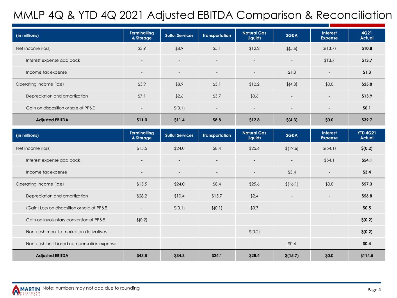 Page 3 MMLP Full-Year 2022 Adjusted EBITDA Comparison & Reconciliation (in millions) Terminalling & Storage Sulfur Services Transportation Natural Gas Liquids SG&A Interest Expense YTD 4Q22 Actual Net income (loss) $18.9 $24.2 $41.4 $(16.3) $(24.8) $(53.7) $(10.3) Interest expense add back - - - - - $53.7 $53.7 Income tax expense - - - - $7.9 - $7.9 Operating Income (loss) $18.9 $24.2 $41.4 $(16.3) $(6.9) $0.0 $51.3 Depreciation and amortization $28.2 $11.1 $14.6 $2.4 - - $56.2 (Gain) loss on disposition or sale of PP&E $0.2 $(4.6) $(1.1) $(0.2) - - $(5.7) Lower of cost or market and other non-cash derivatives - - - $12.8 - - $12.8 Non-cash unit-based compensation expense - - - - $0.2 - $0.2 Adjusted EBITDA $47.3 $30.7 $54.9 $(1.3) $(16.8) $0.0 $114.9 Terminalling & Storage 1Q22A 2Q22A 3Q22A 4Q22A 2022A Smackover Refinery $3.4 $3.9 $3.2 $3.6 $14.1 Fixed-Fee Lubricants & Specialty Products $5.0 $6.1 $6.4 $3.8 $21.4 Margin Specialty Terminals $2.9 $2.8 $2.7 $2.4 $10.8 Fixed-Fee Shore-Based Terminals $0.3 $0.0 $0.0 $0.8 $1.1 Fixed-Fee Total T&S $11.6 $12.9 $2.3 $10.5 $47.3 Natural Gas Liquids 1Q22A 2Q22A 3Q22A 4Q22A 2022A Butane $5.7 $(0.6) $(1.6) $(10.7) $(7.2) Margin Martin Underground $0.4 $0.3 $0.3 $0.5 $1.5 Fixed-Fee Natural Gasoline $(0.6) $1.4 $1.0 $0.3 $2.0 Fixed-Fee Propane $1.1 $0.2 $0.2 $0.8 $2.4 Margin Total NGLs $6.6 $1.3 $(0.2) $(9.1) $(1.3) Sulfur Services 1Q22A 2Q22A 3Q22A 4Q22A 2022A Fertilizer $11.8 $10.0 $(2.8) $2.7 $21.6 Margin Sulfur Prilling $1.7 $2.2 $1.8 $1.0 $6.8 Fixed-Fee Molten Sulfur $1.8 $1.7 (3.2) $2.1 $2.4 Fixed-Fee Total Sulfur Services $15.3 $13.9 $(4.2) $5.7 $30.7 Transportation 1Q22A 2Q22A 3Q22A 4Q22A 2022A Land $9.5 $12.4 $12.3 $11.3 $45.5 Marine $1.0 $2.1 $2.8 $3.4 $9.4 Total Transportation $10.5 $14.5 $15.1 $14.7 $54.9 Fixed-Fee Adjusted EBITDA* $44.0 $42.7 $23.0 $21.9 $131.6 Unallocated SG&A $(4.1) $(4.3) $(4.2) $(4.1) $(16.8) Total Adjusted EBITDA $40.0 $38.3 $18.8 $17.8 $114.9 Note: numbers may not add due to rounding *Pre-Unallocated SG&A
