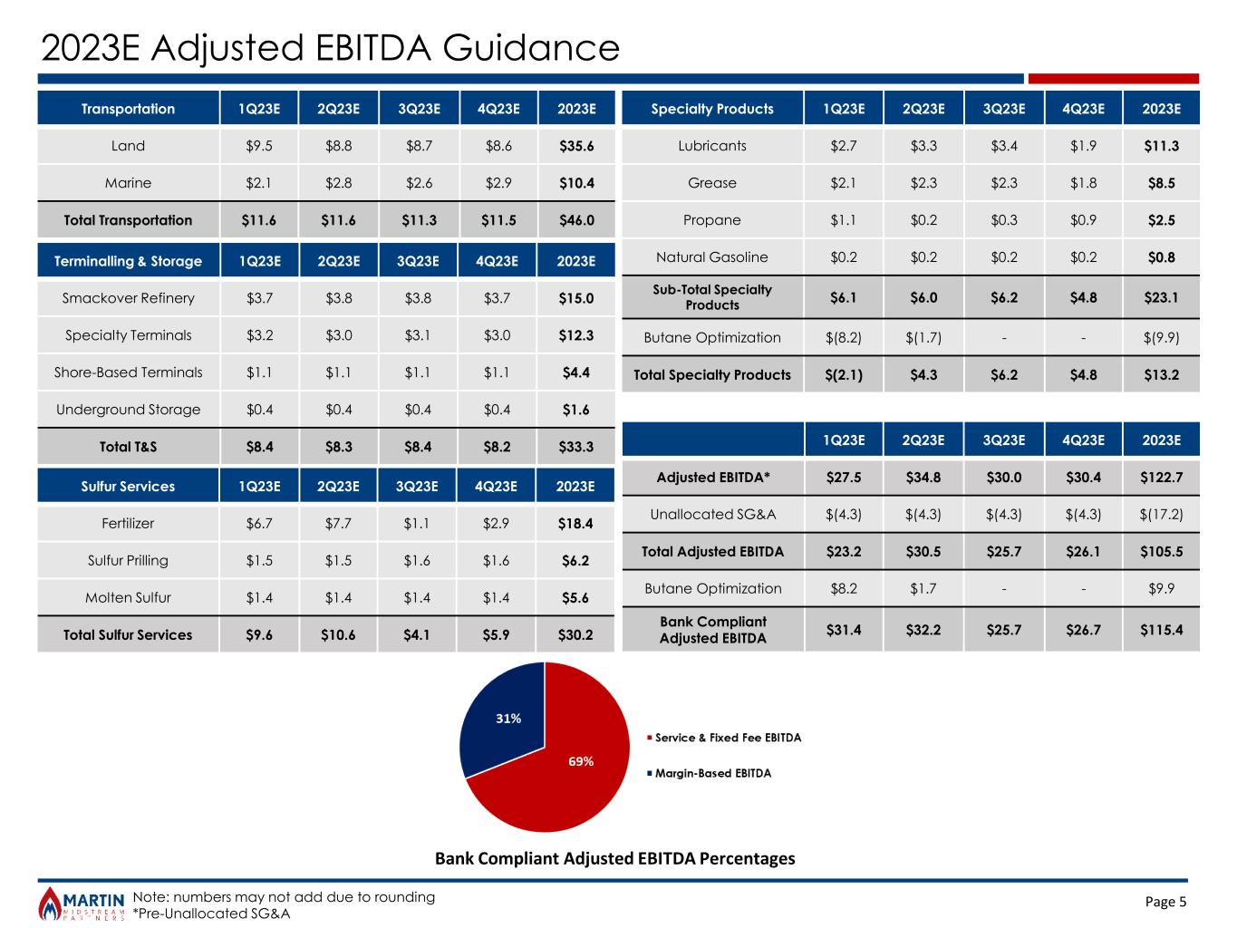 Page 4 MMLP 4Q & YTD 4Q 2021 Adjusted EBITDA Comparison & Reconciliation Note: numbers may not add due to rounding (in millions) Terminalling & Storage Sulfur Services Transportation Natural Gas Liquids SG&A Interest Expense 4Q21 Actual Net income (loss) $3.9 $8.9 $5.1 $12.2 $(5.6) $(13.7) $10.8 Interest expense add back - - - - - $13.7 $13.7 Income tax expense - - - - $1.3 - $1.3 Operating Income (loss) $3.9 $8.9 $5.1 $12.2 $(4.3) $0.0 $25.8 Depreciation and amortization $7.1 $2.6 $3.7 $0.6 - - $13.9 Gain on disposition or sale of PP&E - $(0.1) - - - - $0.1 Adjusted EBITDA $11.0 $11.4 $8.8 $12.8 $(4.3) $0.0 $39.7 (in millions) Terminalling & Storage Sulfur Services Transportation Natural Gas Liquids SG&A Interest Expense YTD 4Q21 Actual Net income (loss) $15.5 $24.0 $8.4 $25.6 $(19.6) $(54.1) $(0.2) Interest expense add back - - - - - $54.1 $54.1 Income tax expense - - - - $3.4 - $3.4 Operating Income (loss) $15.5 $24.0 $8.4 $25.6 $(16.1) $0.0 $57.3 Depreciation and amortization $28.2 $10.4 $15.7 $2.4 - - $56.8 (Gain) Loss on disposition or sale of PP&E - $(0.1) $(0.1) $0.7 - - $0.5 Gain on involuntary conversion of PP&E $(0.2) - - - - - $(0.2) Non-cash mark-to-market on derivatives - - - $(0.2) - - $(0.2) Non-cash unit-based compensation expense - - - - $0.4 - $0.4 Adjusted EBITDA $43.5 $34.3 $24.1 $28.4 $(15.7) $0.0 $114.5
