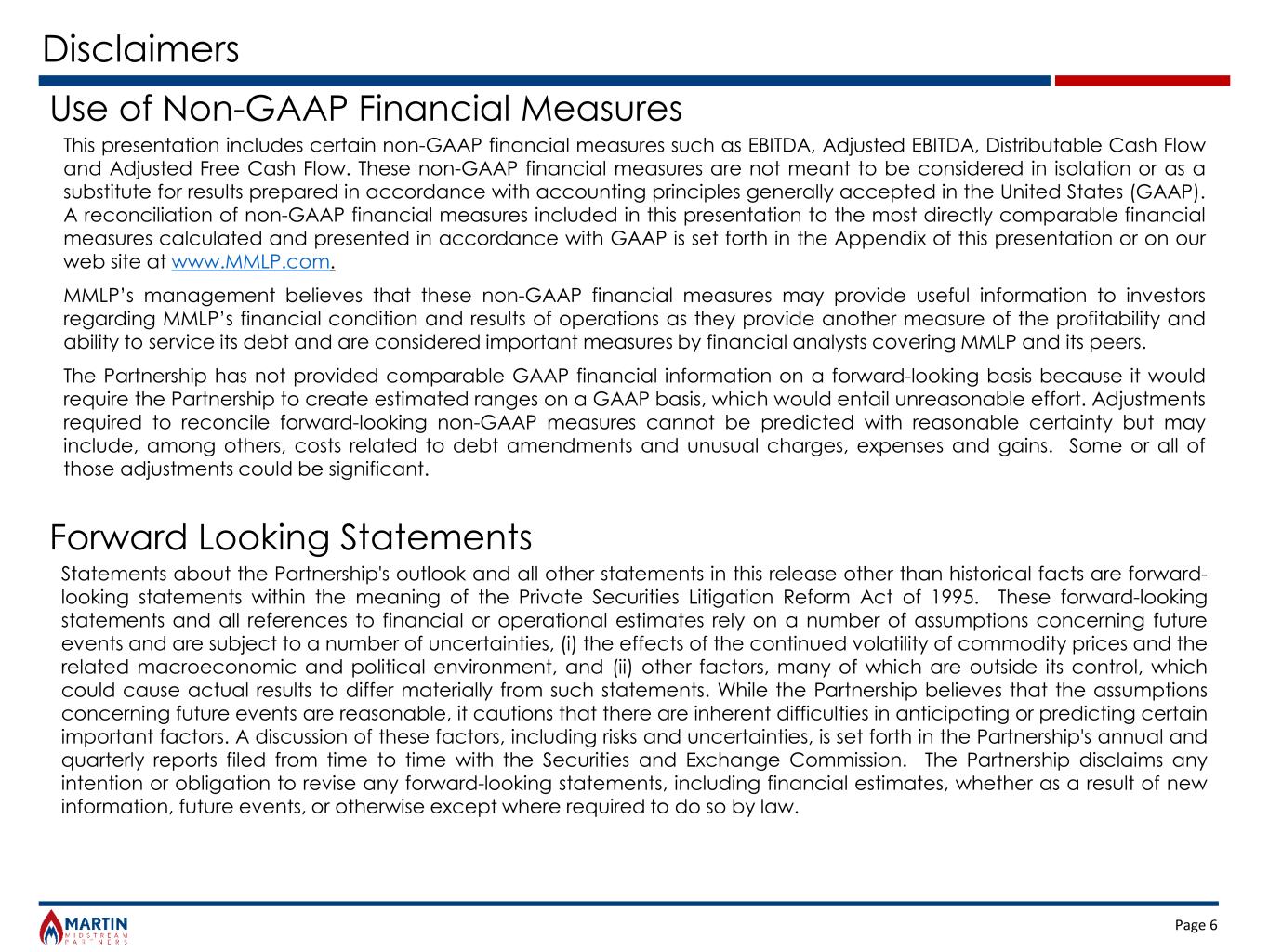 Page 6 Disclaimers Use of Non-GAAP Financial Measures Forward Looking Statements This presentation includes certain non-GAAP financial measures such as EBITDA, Adjusted EBITDA, Distributable Cash Flow and Adjusted Free Cash Flow. These non-GAAP financial measures are not meant to be considered in isolation or as a substitute for results prepared in accordance with accounting principles generally accepted in the United States (GAAP). A reconciliation of non-GAAP financial measures included in this presentation to the most directly comparable financial measures calculated and presented in accordance with GAAP is set forth in the Appendix of this presentation or on our web site at www.MMLP.com. MMLP’s management believes that these non-GAAP financial measures may provide useful information to investors regarding MMLP’s financial condition and results of operations as they provide another measure of the profitability and ability to service its debt and are considered important measures by financial analysts covering MMLP and its peers. The Partnership has not provided comparable GAAP financial information on a forward-looking basis because it would require the Partnership to create estimated ranges on a GAAP basis, which would entail unreasonable effort. Adjustments required to reconcile forward-looking non-GAAP measures cannot be predicted with reasonable certainty but may include, among others, costs related to debt amendments and unusual charges, expenses and gains. Some or all of those adjustments could be significant. Statements about the Partnership's outlook and all other statements in this release other than historical facts are forward- looking statements within the meaning of the Private Securities Litigation Reform Act of 1995. These forward-looking statements and all references to financial or operational estimates rely on a number of assumptions concerning future events and are subject to a number of uncertainties, (i) the effects of the continued volatility of commodity prices and the related macroeconomic and political environment, and (ii) other factors, many of which are outside its control, which could cause actual results to differ materially from such statements. While the Partnership believes that the assumptions concerning future events are reasonable, it cautions that there are inherent difficulties in anticipating or predicting certain important factors. A discussion of these factors, including risks and uncertainties, is set forth in the Partnership's annual and quarterly reports filed from time to time with the Securities and Exchange Commission. The Partnership disclaims any intention or obligation to revise any forward-looking statements, including financial estimates, whether as a result of new information, future events, or otherwise except where required to do so by law.