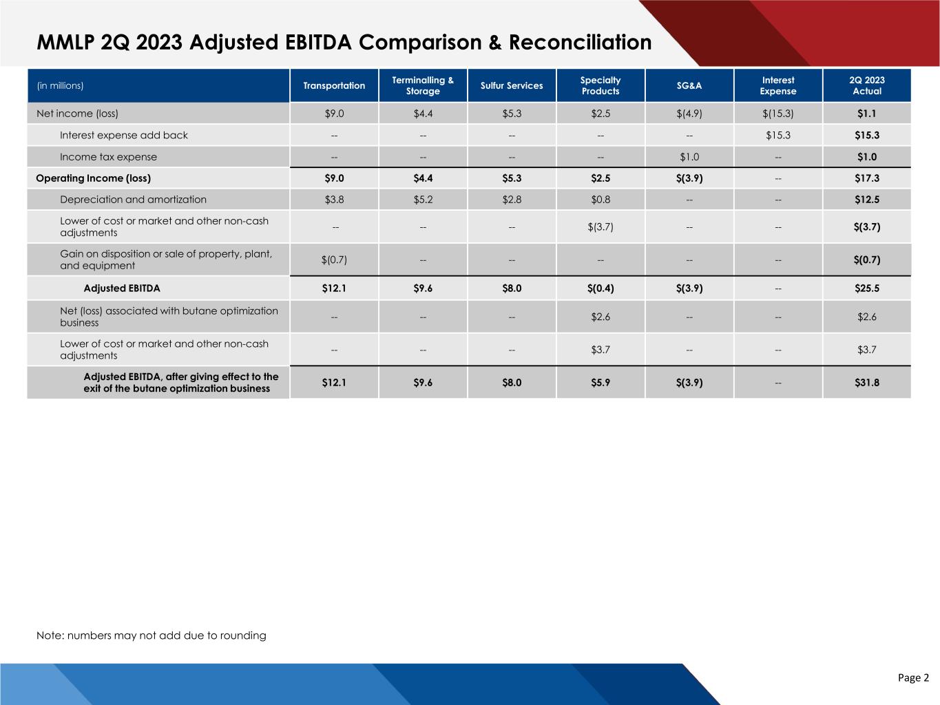 Page 2 (in millions) Transportation Terminalling & Storage Sulfur Services Specialty Products SG&A Interest Expense 2Q 2023 Actual Net income (loss) $9.0 $4.4 $5.3 $2.5 $(4.9) $(15.3) $1.1 Interest expense add back -- -- -- -- -- $15.3 $15.3 Income tax expense -- -- -- -- $1.0 -- $1.0 Operating Income (loss) $9.0 $4.4 $5.3 $2.5 $(3.9) -- $17.3 Depreciation and amortization $3.8 $5.2 $2.8 $0.8 -- -- $12.5 Lower of cost or market and other non-cash adjustments -- -- -- $(3.7) -- -- $(3.7) Gain on disposition or sale of property, plant, and equipment $(0.7) -- -- -- -- -- $(0.7) Adjusted EBITDA $12.1 $9.6 $8.0 $(0.4) $(3.9) -- $25.5 Net (loss) associated with butane optimization business -- -- -- $2.6 -- -- $2.6 Lower of cost or market and other non-cash adjustments -- -- -- $3.7 -- -- $3.7 Adjusted EBITDA, after giving effect to the exit of the butane optimization business $12.1 $9.6 $8.0 $5.9 $(3.9) -- $31.8 MMLP 2Q 2023 Adjusted EBITDA Comparison & Reconciliation Note: numbers may not add due to rounding