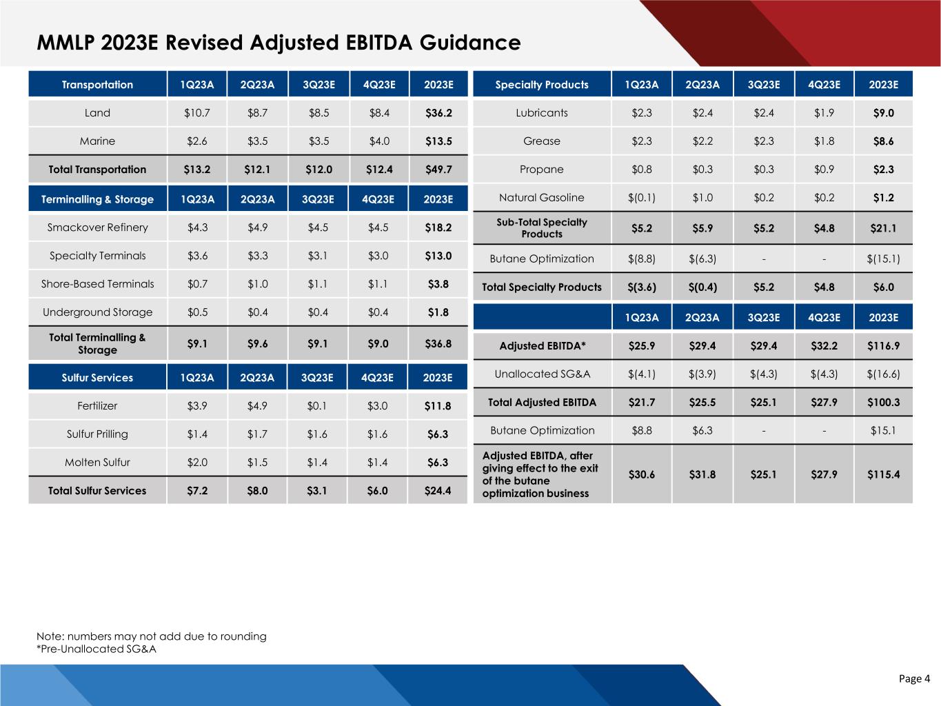 MMLP 2Q 2023 Adjusted EBITDA Comparison to Guidance Page 3 Adjusted EBITDA* $116.9 $34.8 $29.4 Unallocated SG&A $(16.6) $(4.3) $(3.9) Total Adjusted EBITDA $100.3 $30.5 $25.5 Butane Optimization $15.1 $1.7 $6.3 Adjusted EBITDA, after giving effect to the exit of the butane optimization business $115.4 $32.2 $31.8 Terminalling & Storage 2023E 2Q23E 2Q23A Smackover Refinery $18.2 $3.8 $4.9 Specialty Terminals $13.0 $3.0 $3.3 Shore-Based Terminals $3.8 $1.1 $1.0 Underground Storage $1.8 $0.4 $0.4 Total Terminalling & Storage $36.8 $8.3 $9.6 Specialty Products 2023E 2Q23E 2Q23A Lubricants $9.0 $3.3 $2.4 Grease $8.6 $2.3 $2.2 Propane $2.3 $0.2 $0.3 Natural Gasoline $1.2 $0.2 $1.0 Sub-Total Specialty Products $21.1 $6.0 $5.9 Butane Optimization $(15.1) $(1.7) $(6.3) Total Specialty Products $6.0 $4.3 $(0.4) Sulfur Services 2023E 2Q23E 2Q23A Fertilizer $11.8 $7.7 $4.9 Sulfur Prilling $6.3 $1.5 $1.7 Molten Sulfur $6.3 $1.4 $1.5 Total Sulfur Services $24.4 $10.6 $8.0 Transportation 2023E 2Q23E 2Q23A Land $36.2 $8.8 $8.7 Marine $13.5 $2.8 $3.5 Total Transportation $49.7 $11.6 $12.1 Note: numbers may not add due to rounding *Pre-Unallocated SG&A