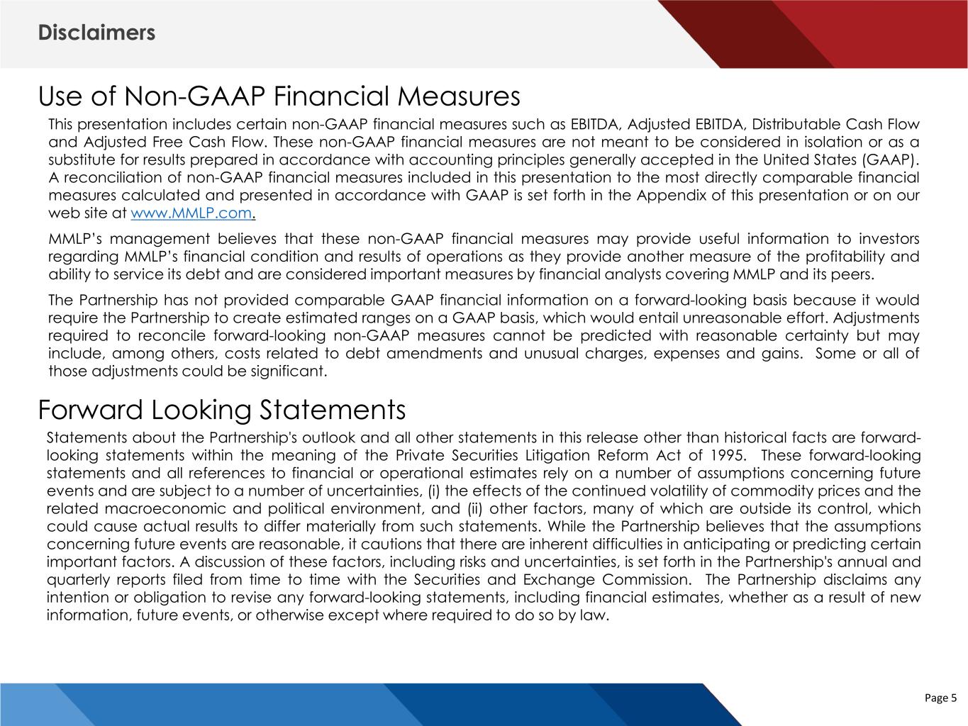 Page 4 MMLP 2023E Revised Adjusted EBITDA Guidance Specialty Products 1Q23A 2Q23A 3Q23E 4Q23E 2023E Lubricants $2.3 $2.4 $2.4 $1.9 $9.0 Grease $2.3 $2.2 $2.3 $1.8 $8.6 Propane $0.8 $0.3 $0.3 $0.9 $2.3 Natural Gasoline $(0.1) $1.0 $0.2 $0.2 $1.2 Sub-Total Specialty Products $5.2 $5.9 $5.2 $4.8 $21.1 Butane Optimization $(8.8) $(6.3) - - $(15.1) Total Specialty Products $(3.6) $(0.4) $5.2 $4.8 $6.0 Terminalling & Storage 1Q23A 2Q23A 3Q23E 4Q23E 2023E Smackover Refinery $4.3 $4.9 $4.5 $4.5 $18.2 Specialty Terminals $3.6 $3.3 $3.1 $3.0 $13.0 Shore-Based Terminals $0.7 $1.0 $1.1 $1.1 $3.8 Underground Storage $0.5 $0.4 $0.4 $0.4 $1.8 Total Terminalling & Storage $9.1 $9.6 $9.1 $9.0 $36.8 Sulfur Services 1Q23A 2Q23A 3Q23E 4Q23E 2023E Fertilizer $3.9 $4.9 $0.1 $3.0 $11.8 Sulfur Prilling $1.4 $1.7 $1.6 $1.6 $6.3 Molten Sulfur $2.0 $1.5 $1.4 $1.4 $6.3 Total Sulfur Services $7.2 $8.0 $3.1 $6.0 $24.4 Transportation 1Q23A 2Q23A 3Q23E 4Q23E 2023E Land $10.7 $8.7 $8.5 $8.4 $36.2 Marine $2.6 $3.5 $3.5 $4.0 $13.5 Total Transportation $13.2 $12.1 $12.0 $12.4 $49.7 1Q23A 2Q23A 3Q23E 4Q23E 2023E Adjusted EBITDA* $25.9 $29.4 $29.4 $32.2 $116.9 Unallocated SG&A $(4.1) $(3.9) $(4.3) $(4.3) $(16.6) Total Adjusted EBITDA $21.7 $25.5 $25.1 $27.9 $100.3 Butane Optimization $8.8 $6.3 - - $15.1 Adjusted EBITDA, after giving effect to the exit of the butane optimization business $30.6 $31.8 $25.1 $27.9 $115.4 Note: numbers may not add due to rounding *Pre-Unallocated SG&A