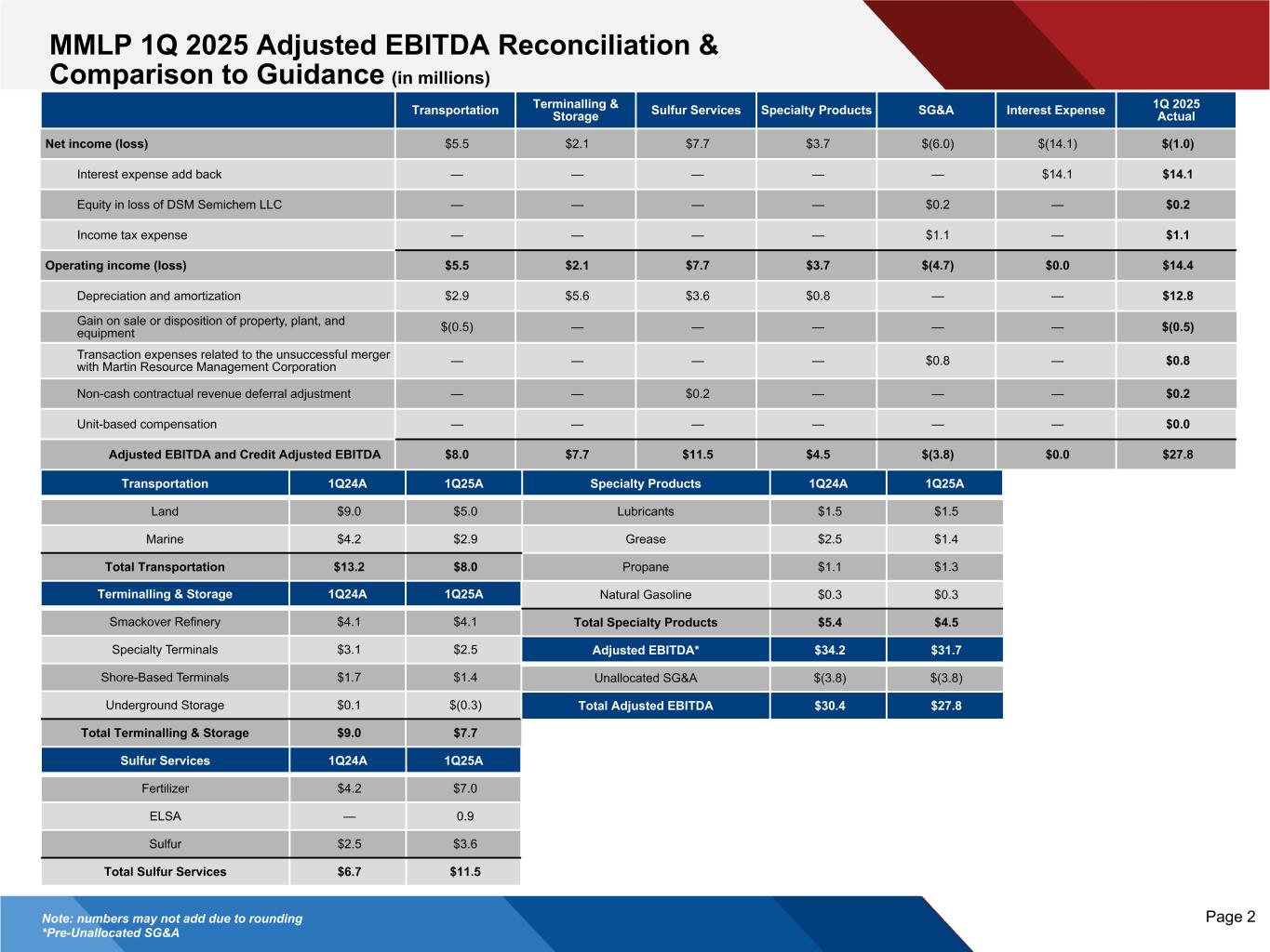MMLP 1Q 2025 Adjusted EBITDA Reconciliation & Comparison to Guidance (in millions) Page 2 Terminalling & Storage 1Q24A 1Q25A Smackover Refinery $4.1 $4.1 Specialty Terminals $3.1 $2.5 Shore-Based Terminals $1.7 $1.4 Underground Storage $0.1 $(0.3) Total Terminalling & Storage $9.0 $7.7 Specialty Products 1Q24A 1Q25A Lubricants $1.5 $1.5 Grease $2.5 $1.4 Propane $1.1 $1.3 Natural Gasoline $0.3 $0.3 Total Specialty Products $5.4 $4.5 Adjusted EBITDA* $34.2 $31.7 Unallocated SG&A $(3.8) $(3.8) Total Adjusted EBITDA $30.4 $27.8 Sulfur Services 1Q24A 1Q25A Fertilizer $4.2 $7.0 ELSA — 0.9 Sulfur $2.5 $3.6 Total Sulfur Services $6.7 $11.5 Transportation 1Q24A 1Q25A Land $9.0 $5.0 Marine $4.2 $2.9 Total Transportation $13.2 $8.0 Note: numbers may not add due to rounding *Pre-Unallocated SG&A Transportation Terminalling & Storage Sulfur Services Specialty Products SG&A Interest Expense 1Q 2025 Actual Net income (loss) $5.5 $2.1 $7.7 $3.7 $(6.0) $(14.1) $(1.0) Interest expense add back — — — — — $14.1 $14.1 Equity in loss of DSM Semichem LLC — — — — $0.2 — $0.2 Income tax expense — — — — $1.1 — $1.1 Operating income (loss) $5.5 $2.1 $7.7 $3.7 $(4.7) $0.0 $14.4 Depreciation and amortization $2.9 $5.6 $3.6 $0.8 — — $12.8 Gain on sale or disposition of property, plant, and equipment $(0.5) — — — — — $(0.5) Transaction expenses related to the unsuccessful merger with Martin Resource Management Corporation — — — — $0.8 — $0.8 Non-cash contractual revenue deferral adjustment — — $0.2 — — — $0.2 Unit-based compensation — — — — — — $0.0 Adjusted EBITDA and Credit Adjusted EBITDA $8.0 $7.7 $11.5 $4.5 $(3.8) $0.0 $27.8