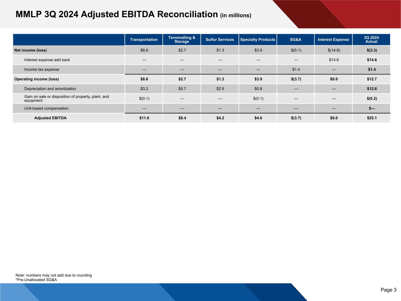 MMLP 3Q 2025 Adjusted EBITDA Reconciliation & Comparison (in millions) Page 2 Terminalling & Storage 3Q24A 3Q25A Smackover Refinery $3.8 $3.8 Specialty Terminals $2.9 $2.7 Shore-Based Terminals $1.3 $1.5 Underground Storage $0.4 $1.8 Total Terminalling & Storage $8.4 $9.7 Specialty Products 3Q24A 3Q25A Lubricants $2.2 $2.4 Grease $1.9 $1.0 Propane $0.4 $0.2 Natural Gasoline $0.1 $0.3 Total Specialty Products $4.6 $3.9 Adjusted EBITDA* $28.8 $22.9 Unallocated SG&A $(3.7) $(3.6) Total Adjusted EBITDA $25.1 $19.3 Sulfur Services 3Q24A 3Q25A Fertilizer $0.4 $0.7 ELSA $— $0.7 Sulfur $3.7 $2.5 Total Sulfur Services $4.2 $3.9 Transportation 3Q24A 3Q25A Land $6.5 $5.3 Marine $5.1 $0.1 Total Transportation $11.6 $5.3 Note: numbers may not add due to rounding *Pre-Unallocated SG&A Transportation Terminalling & Storage Sulfur Services Specialty Products SG&A Interest Expense 3Q 2025 Actual Net income (loss) $2.8 $4.6 $0.2 $3.2 $(4.6) $(14.6) $(8.4) Interest expense add back — — — — — $14.6 $14.6 Equity in loss of DSM Semichem LLC — — — — — — $— Income tax expense — — — — $0.7 — $0.7 Operating income (loss) $2.8 $4.6 $0.2 $3.2 $(3.9) $0.0 $6.9 Depreciation and amortization $2.9 $5.1 $3.5 $0.8 — — $12.3 Gain on sale or disposition of property, plant, and equipment $(0.4) — — — — — $(0.4) Non-cash contractual revenue deferral adjustment — — $0.2 — — — $0.2 Unit-based compensation — — — — $0.1 — $0.1 Adjusted EBITDA and Credit Adjusted EBITDA $5.3 $9.7 $3.9 $3.9 $(3.6) $0.0 $19.3